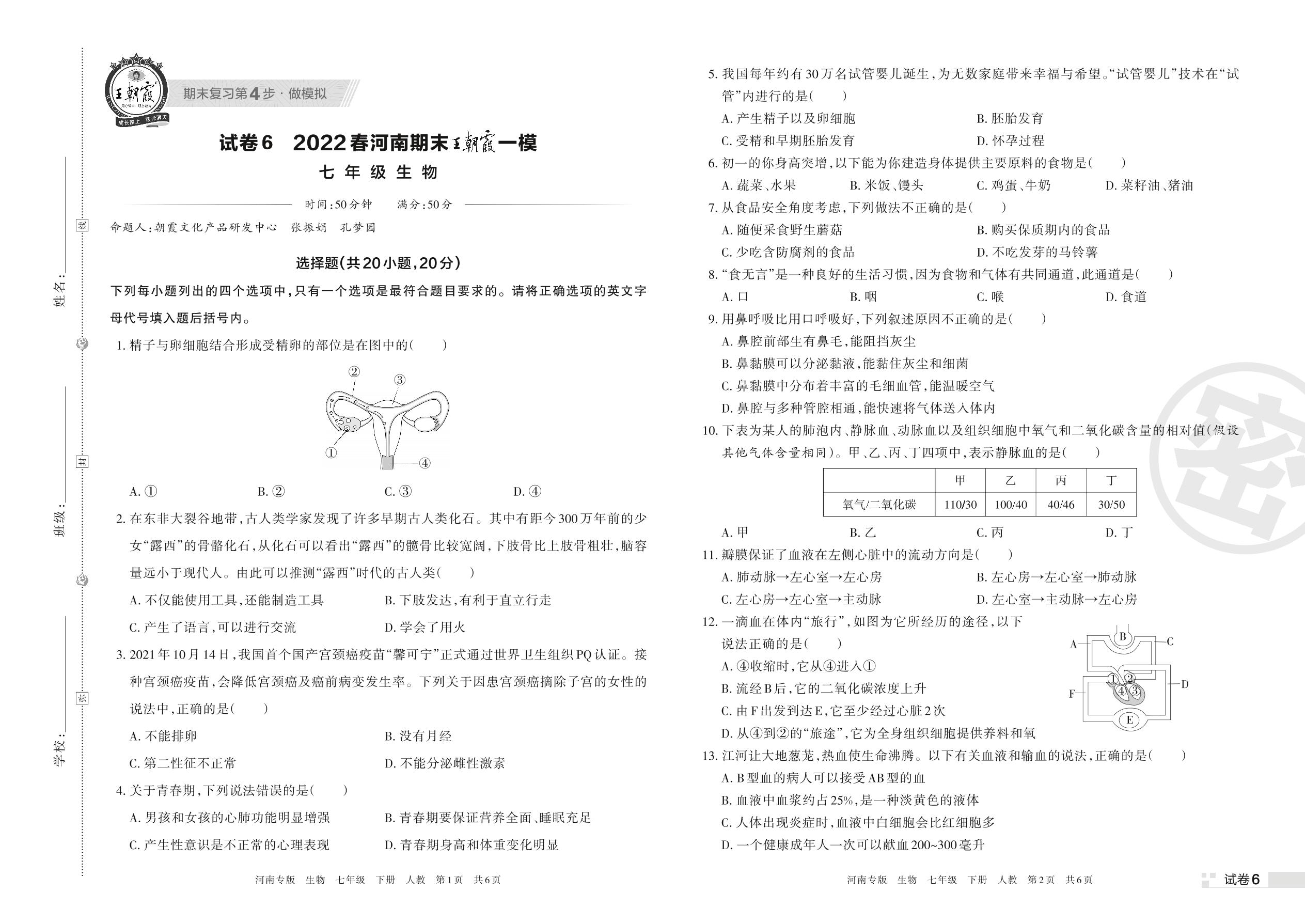 王朝霞期末模拟卷七年级下册生物(人教版)【6】