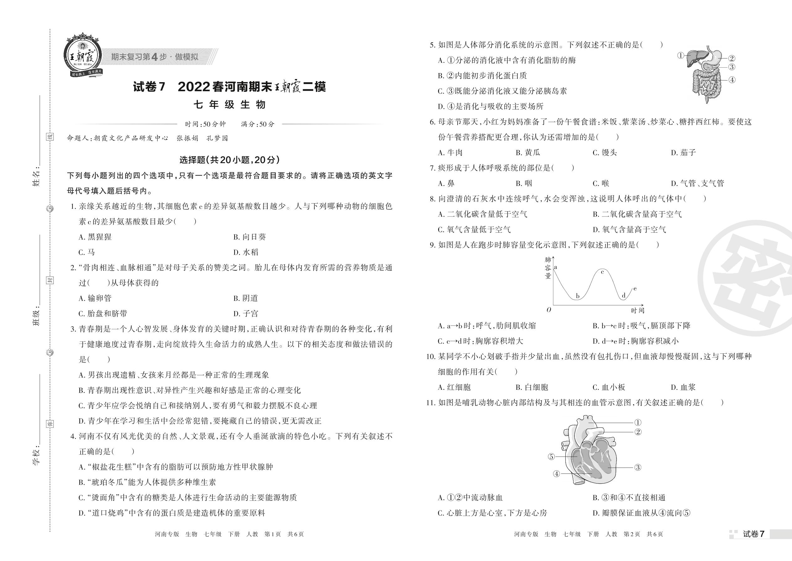 王朝霞期末模拟卷七年级下册生物(人教版)【7】