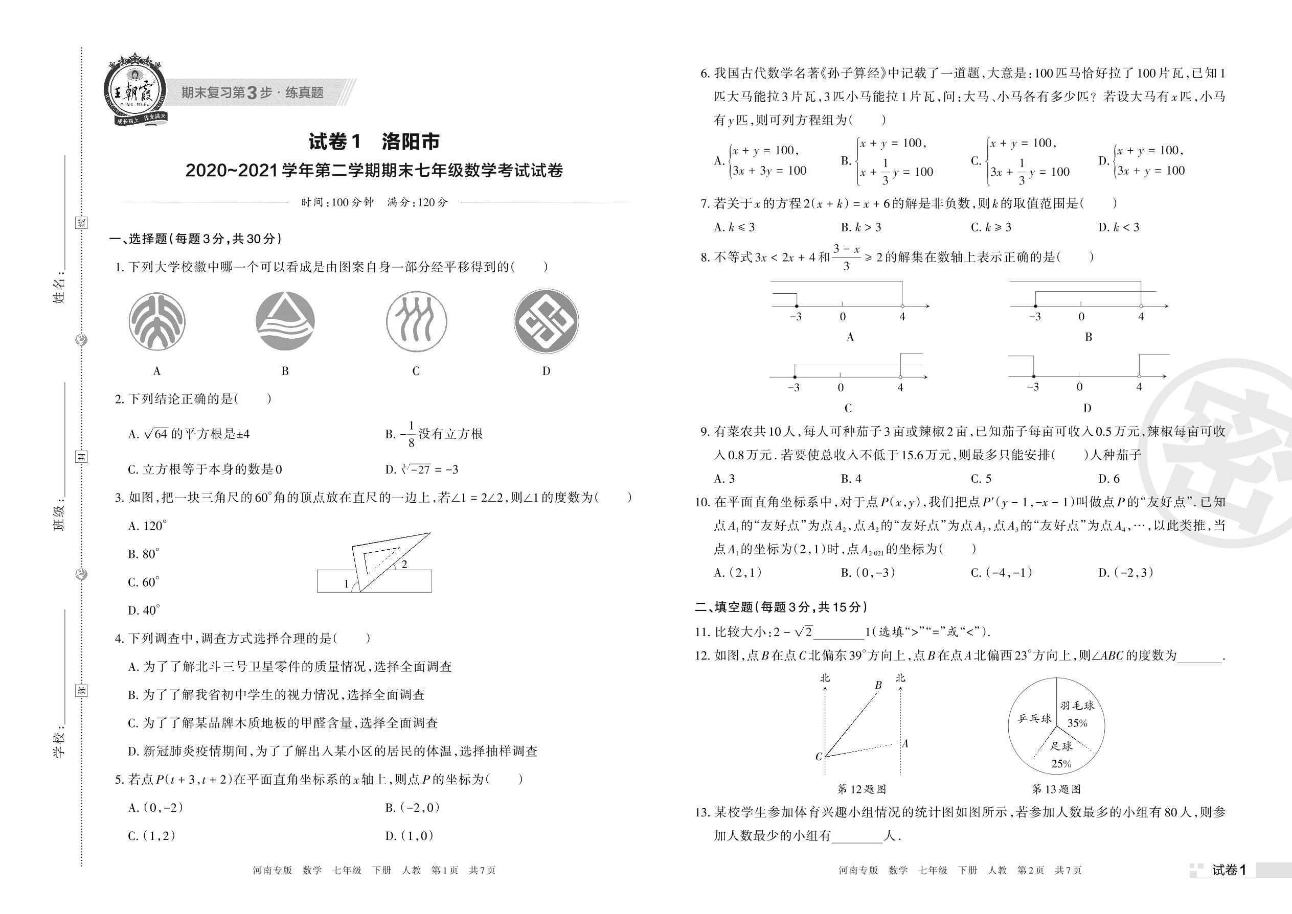 洛阳市2020~2021学年第二学期期末七年级数学考试试卷(人教版)【1】