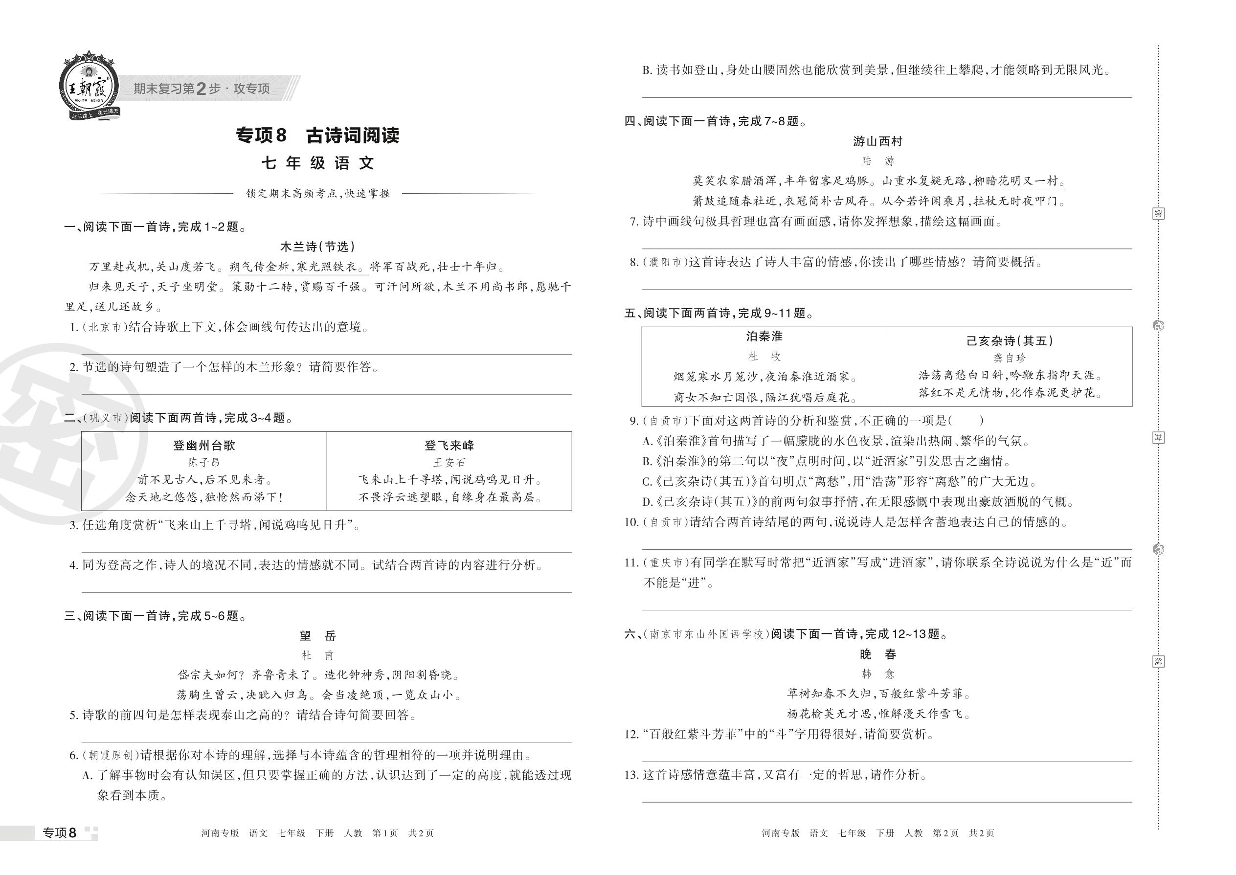 王朝霞期末专项卷——古诗词阅读七年级下册语文(人教版)【8】
