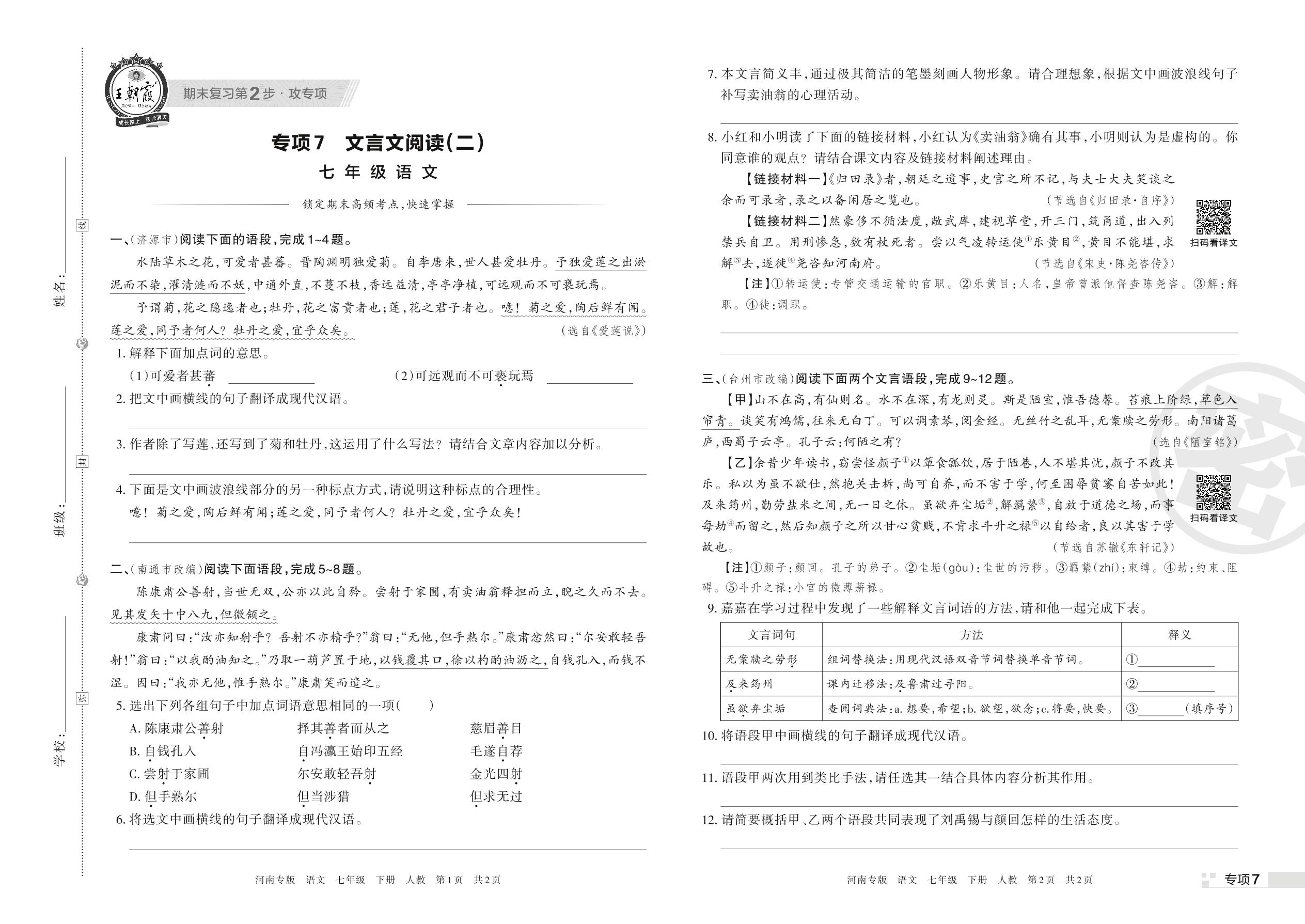 王朝霞期末专项卷——文言文阅读(二)七年级下册语文(人教版)【7】