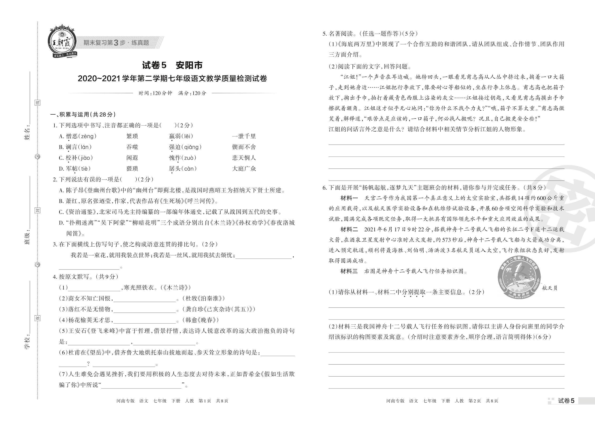 安阳市2020~2021学年第二学期七年级语文教学质量检测试卷(人教版)【5】