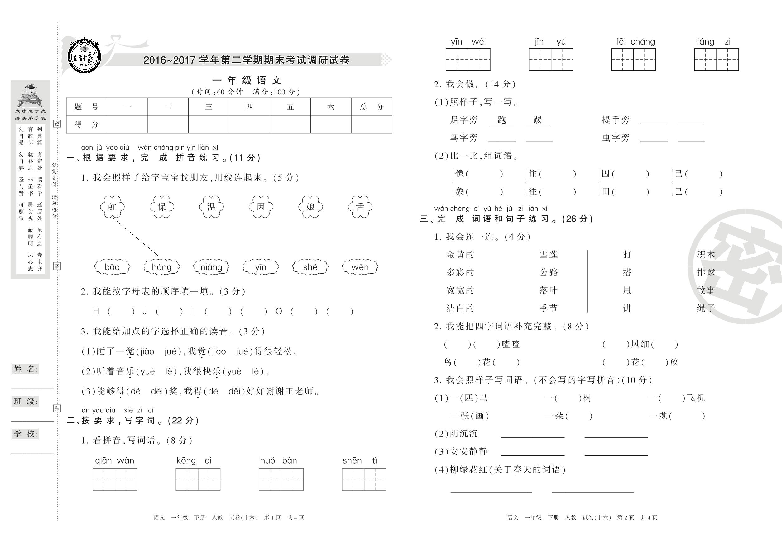 王朝霞期末调研卷一年级下册语文(人教版)_R210731183317【16】
