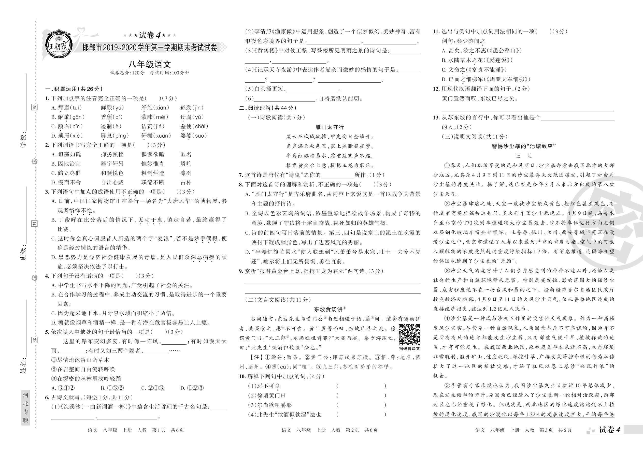 2019-2020学年第一学期邯郸市八年级语文试卷(人教版)【4】