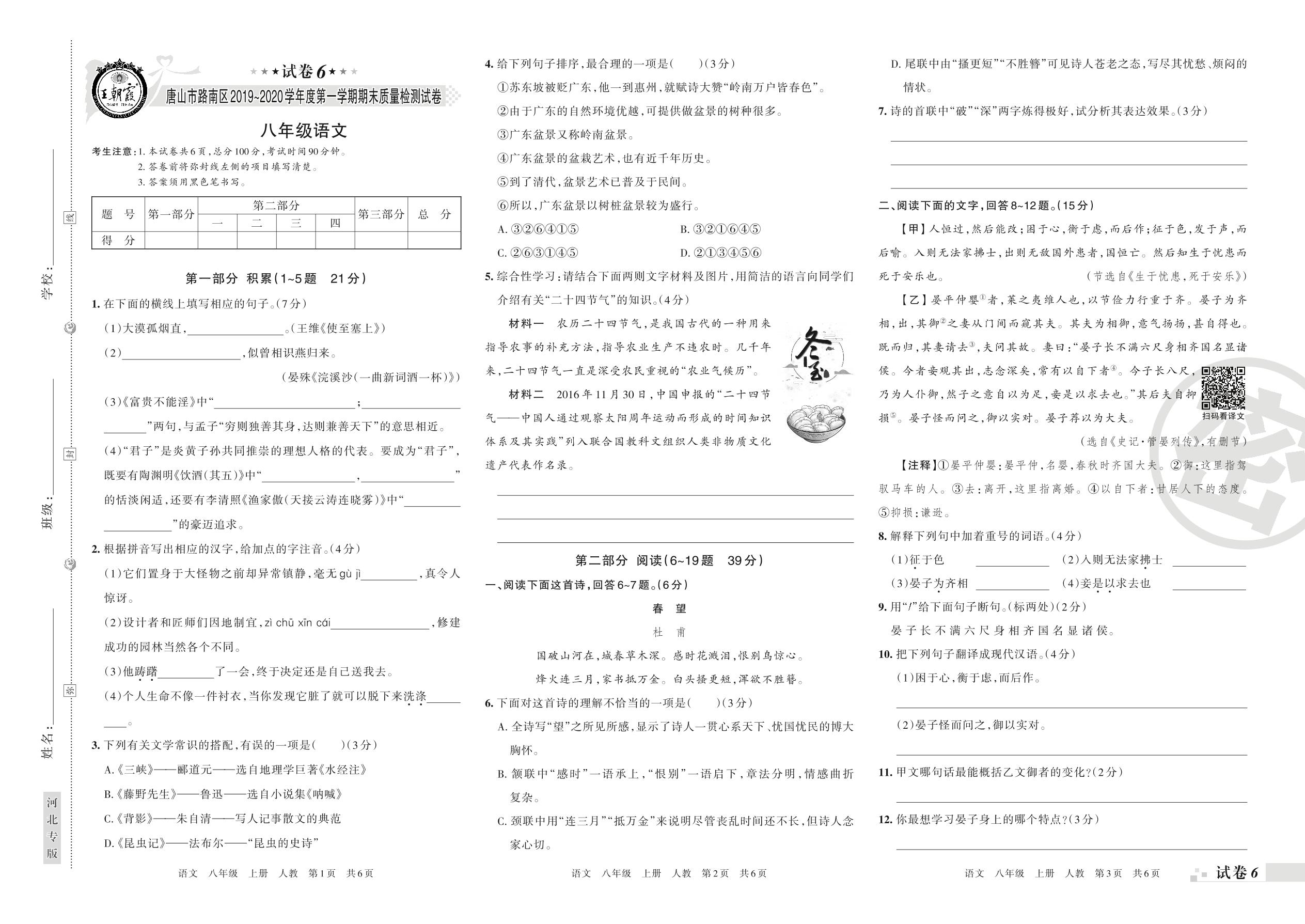 2019-2020学年第一学期唐山市路南区八年级语文试卷(人教版)【6】