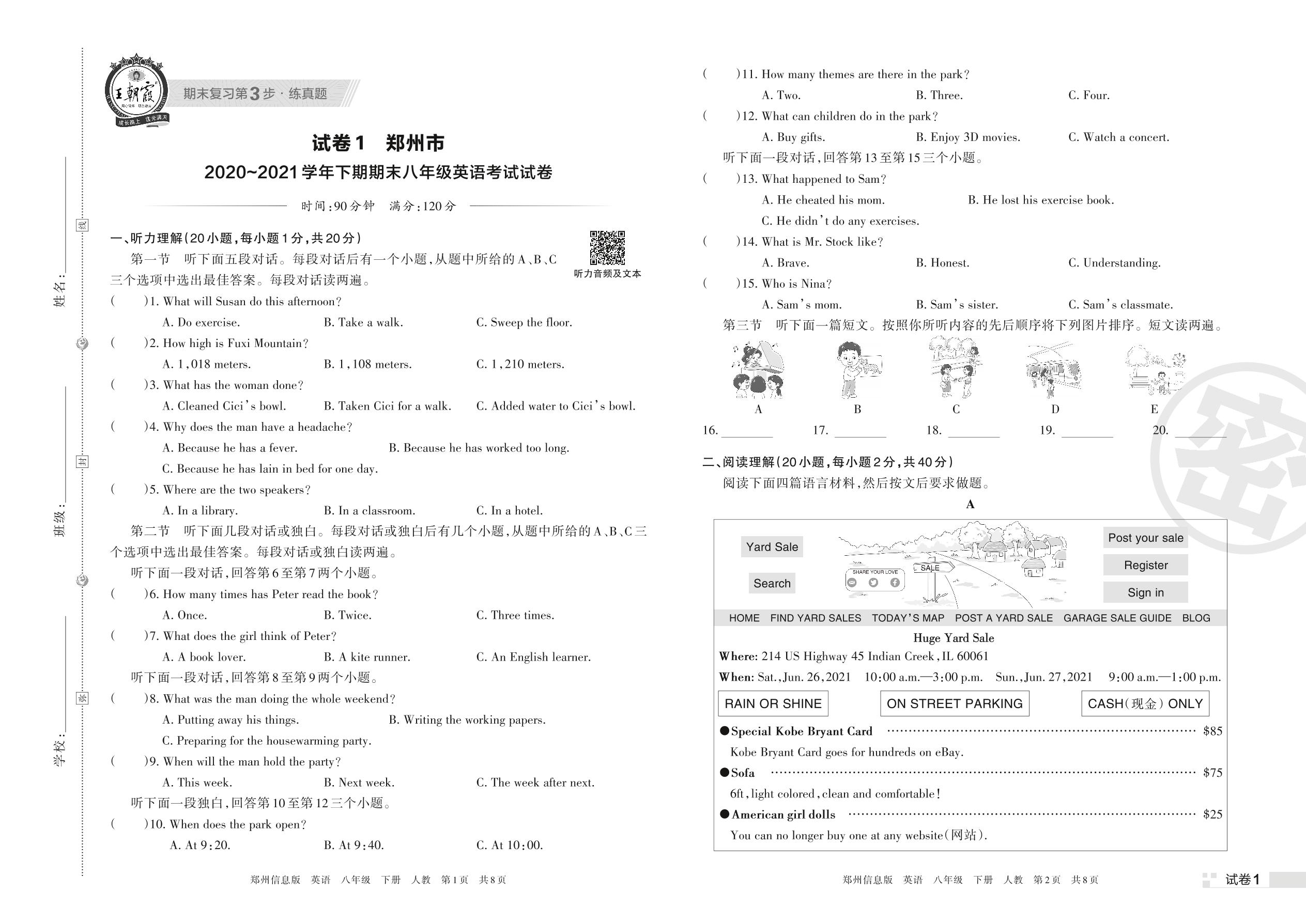 郑州市2020~2021学年下期期末八年级英语考试试卷(人教版)【1】