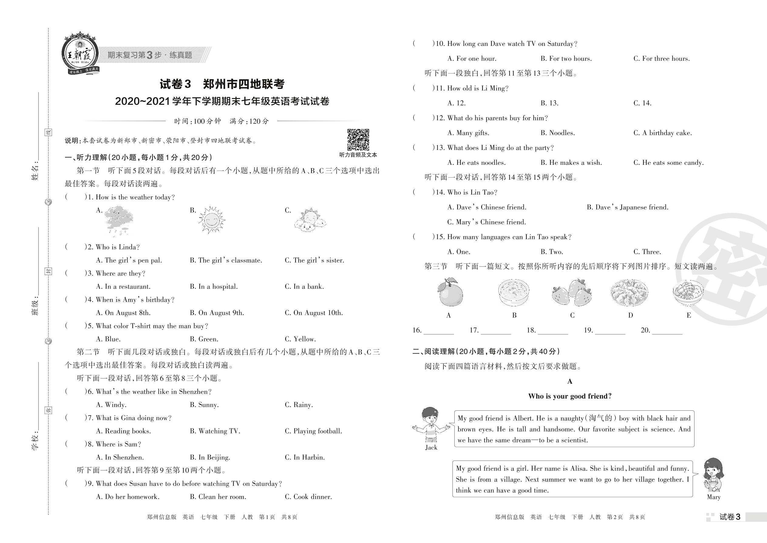 郑州市四地联考2020~2021学年下学期期末七年级英语考试试卷(人教版)【3】