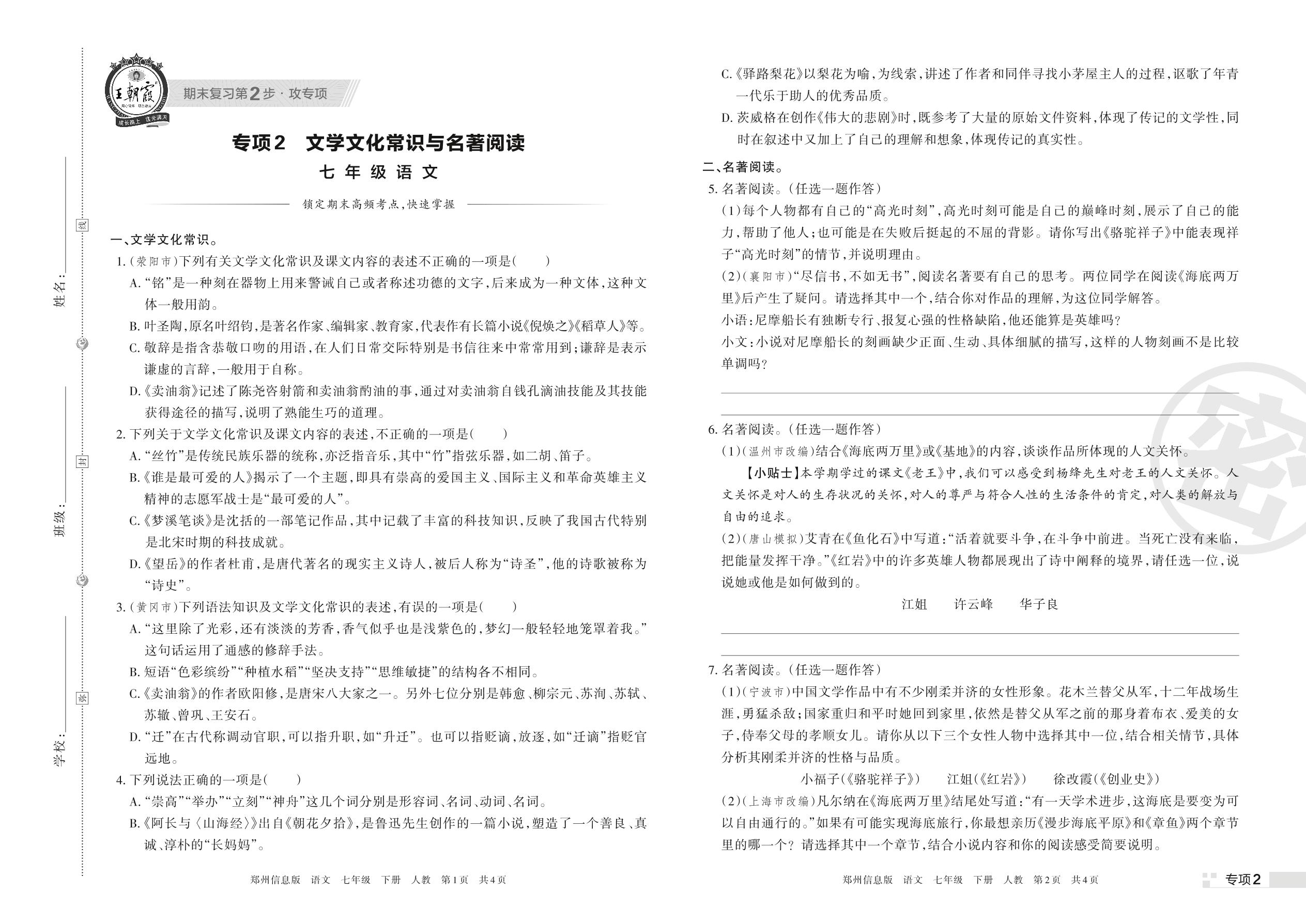王朝霞期末专项卷——文学文化常识与名著阅读七年级下册语文(人教版)_R220323162543549【2】