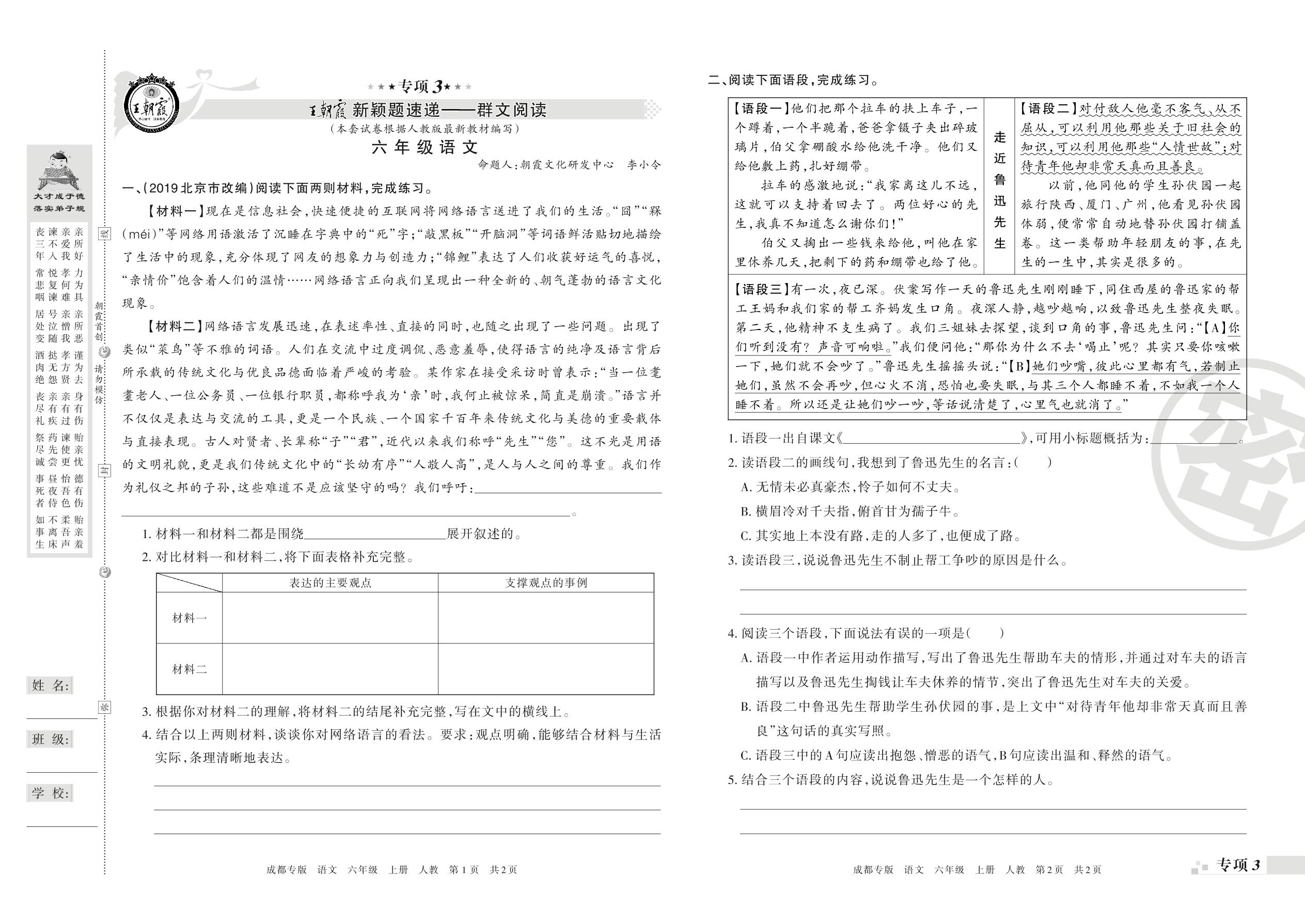 王朝霞期末专项卷——群文阅读、古诗文阅读六年级上册语文(人教版)_R21080212323【0】