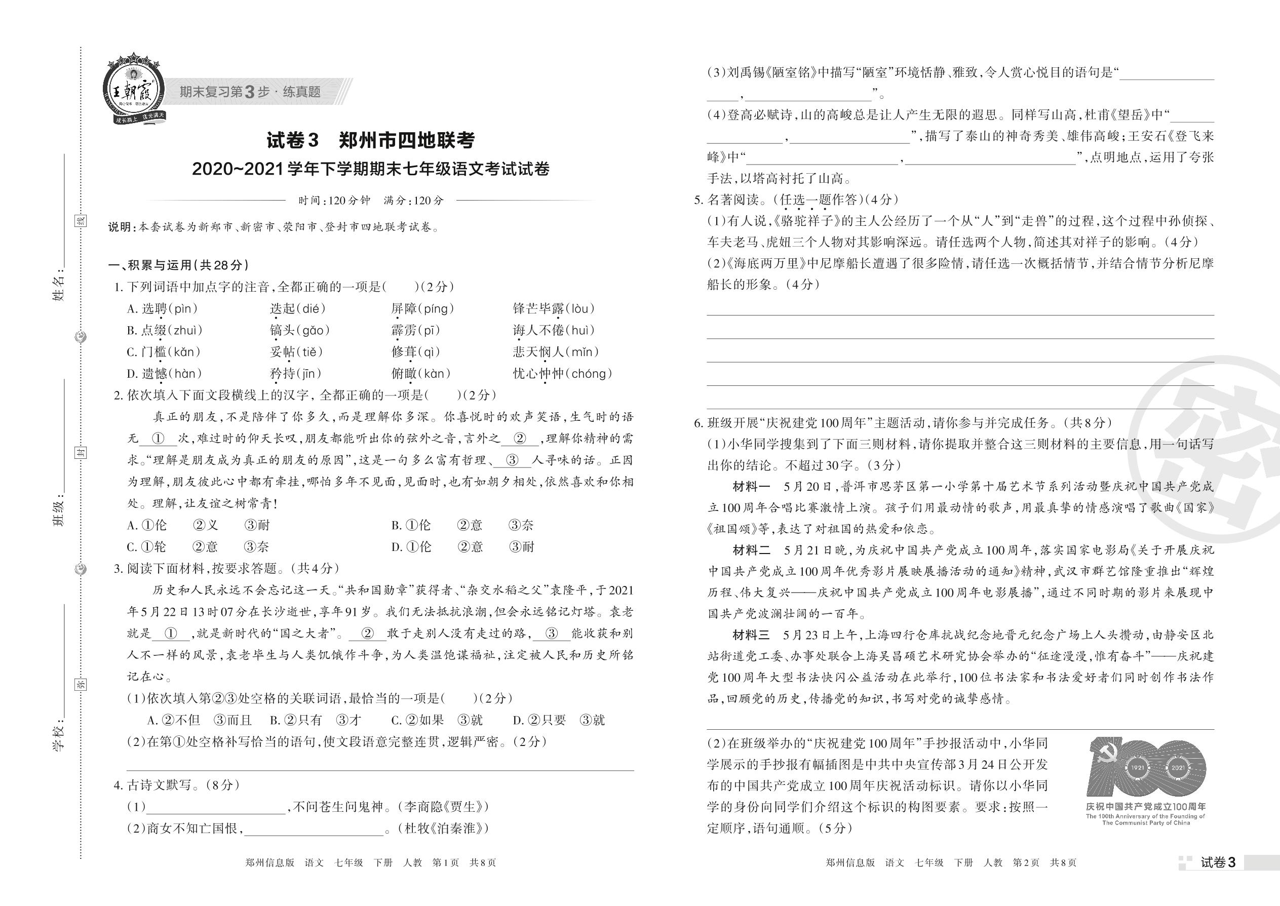 郑州市四地联考2020~2021学年下学期期末七年级语文考试试卷(人教版)【3】