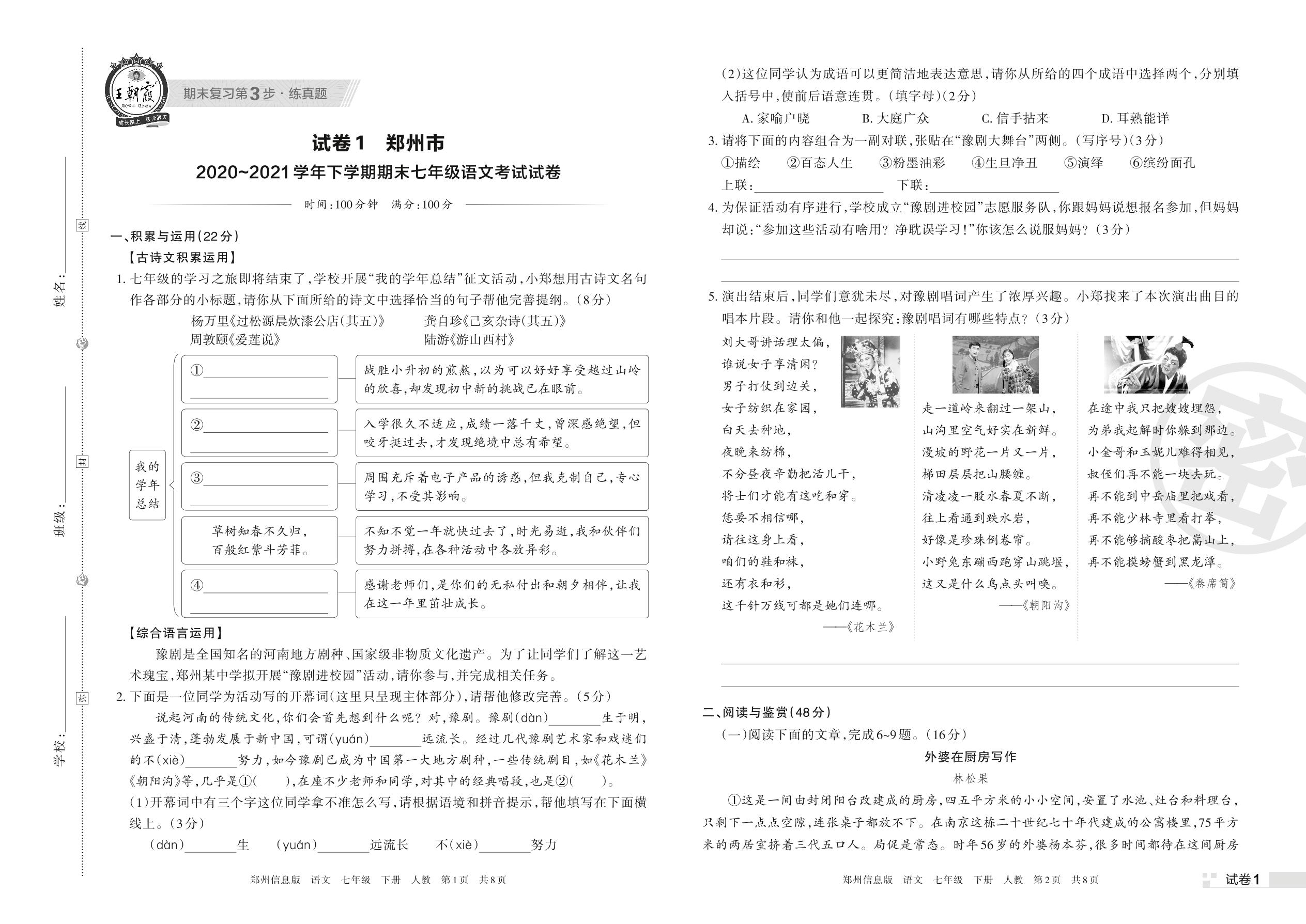郑州市2020~2021学年下学期期末七年级语文考试试卷(人教版)_R220323162543457【1】