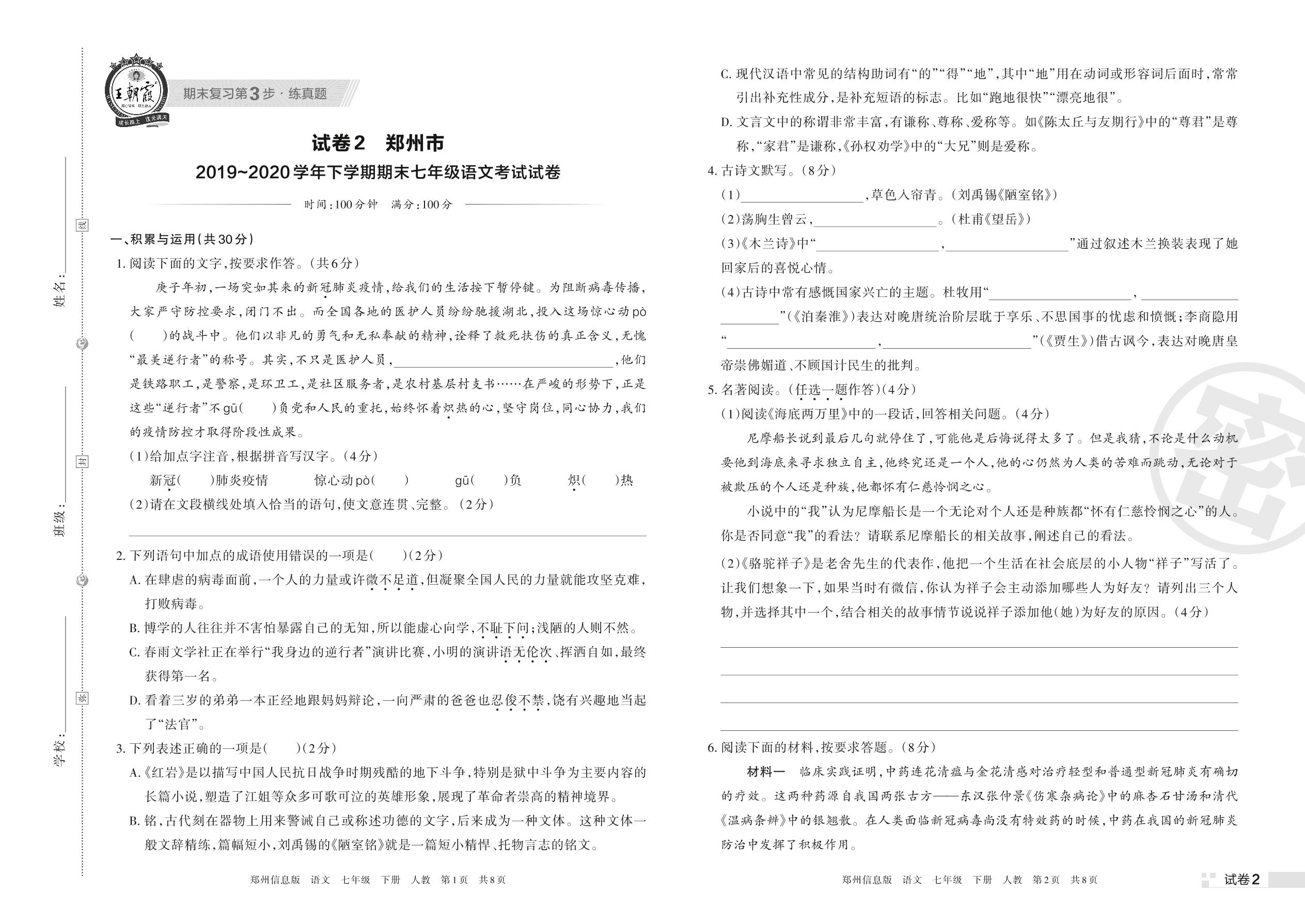郑州市2019~2020学年下学期期末七年级语文考试试卷(人教版)【2】