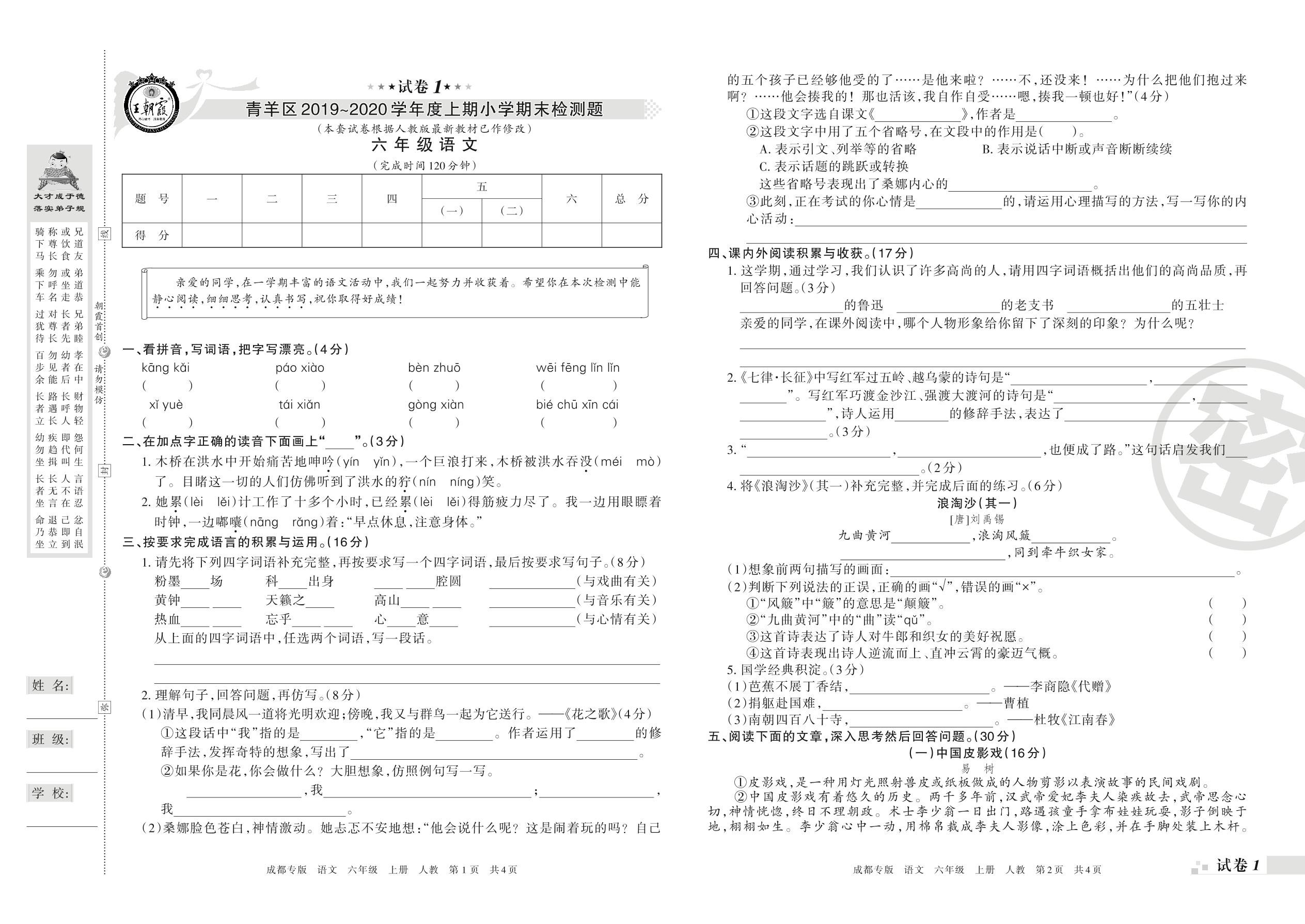 2019-2020学年第一学期成都市青羊区六年级语文试卷(人教版)【1】