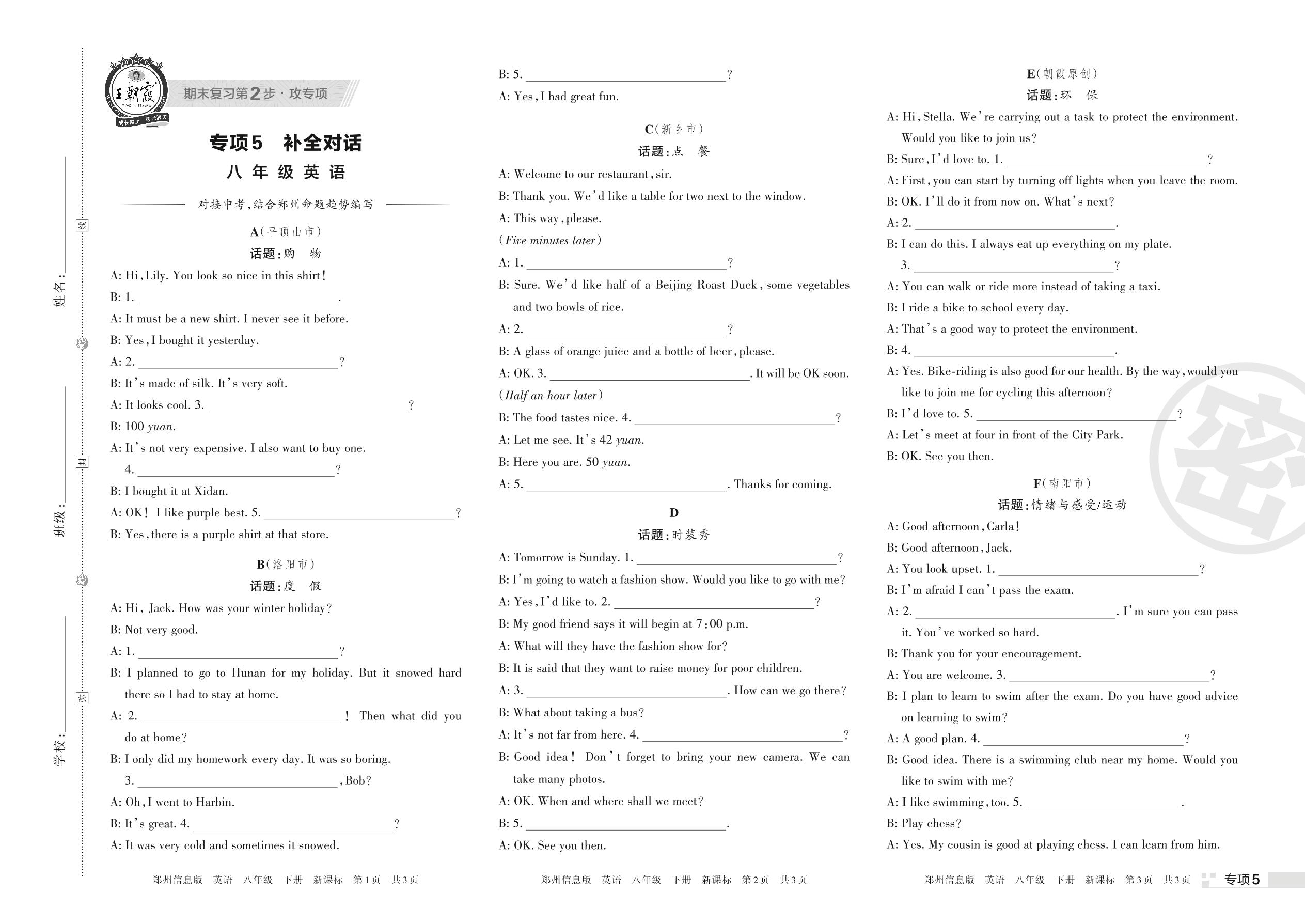 王朝霞期末专项卷——补全对话八年级下册英语(新课标版)【5】