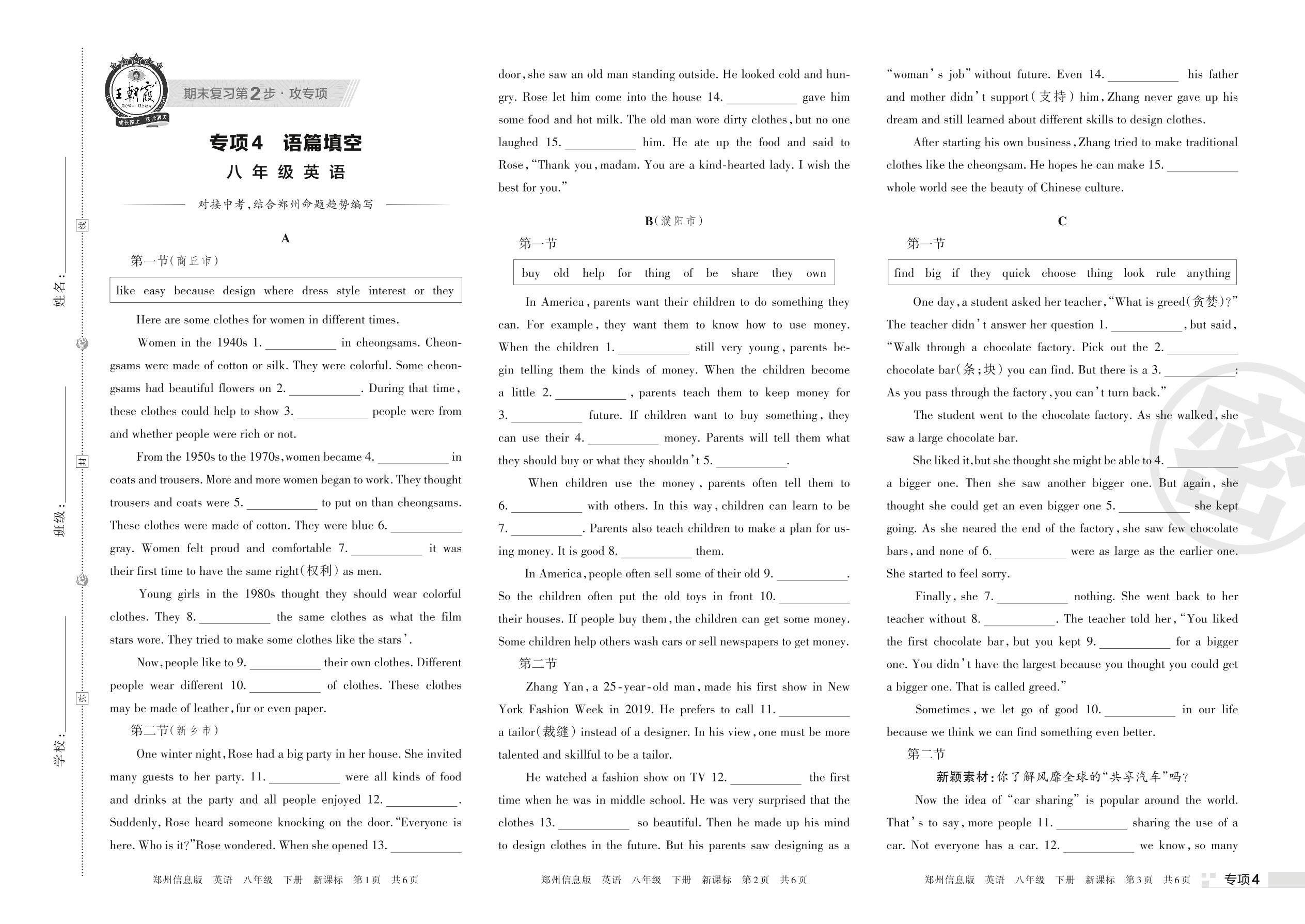 王朝霞期末专项卷——语篇填空八年级下册英语(新课标版)【4】