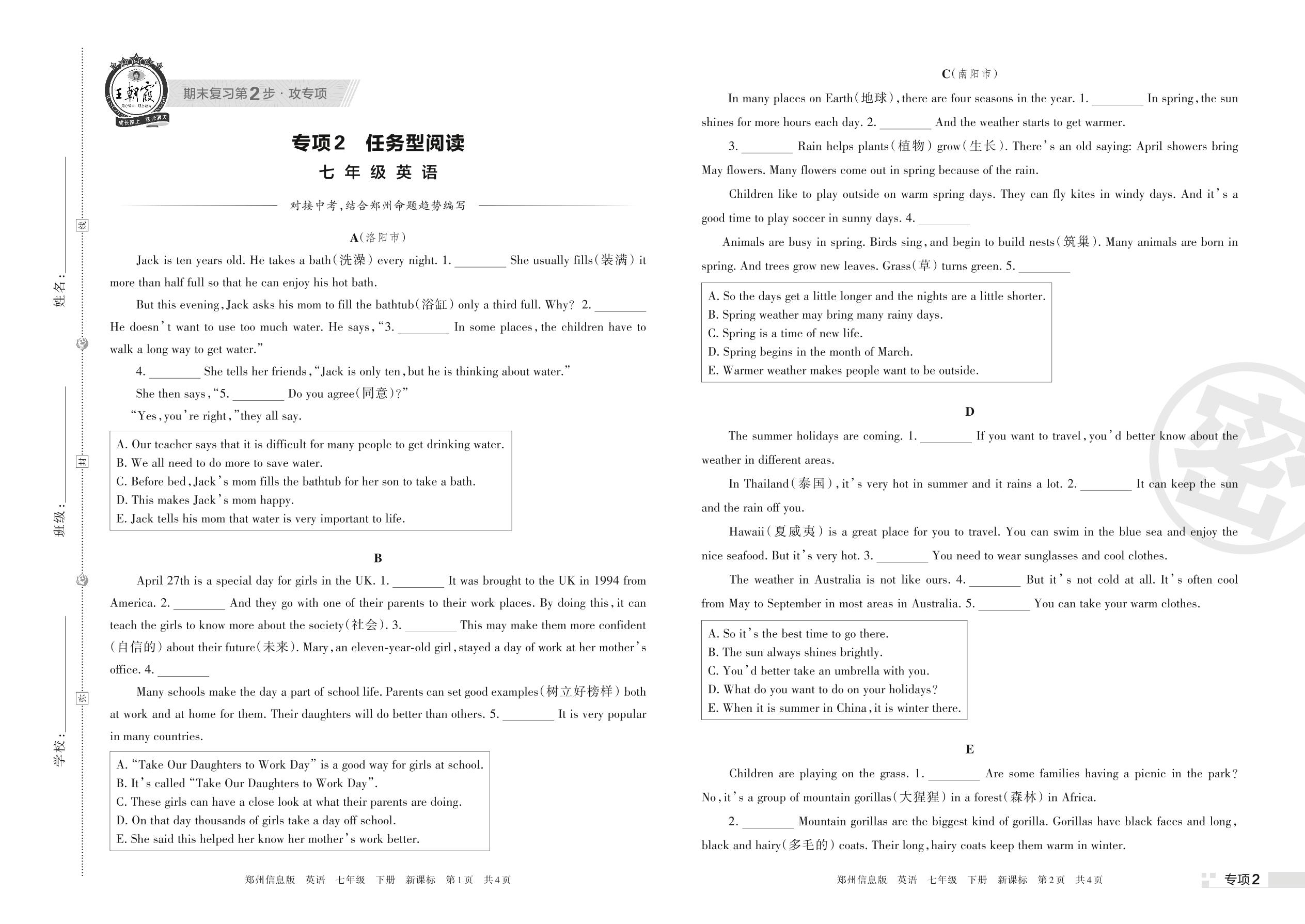 王朝霞期末专项卷——任务型阅读七年级下册英语(新课标版)【2】