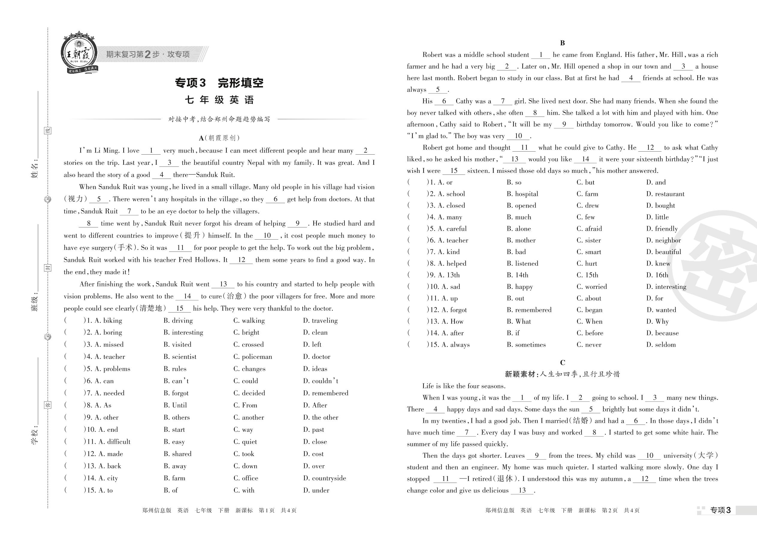 王朝霞期末专项卷——完形填空七年级下册英语(新课标版)【3】