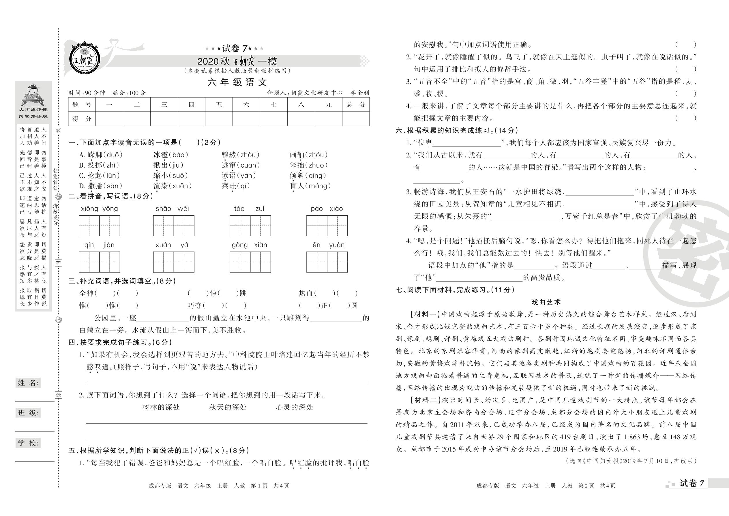 王朝霞期末模拟卷六年级上册语文(人教版)_R21080212401【7】