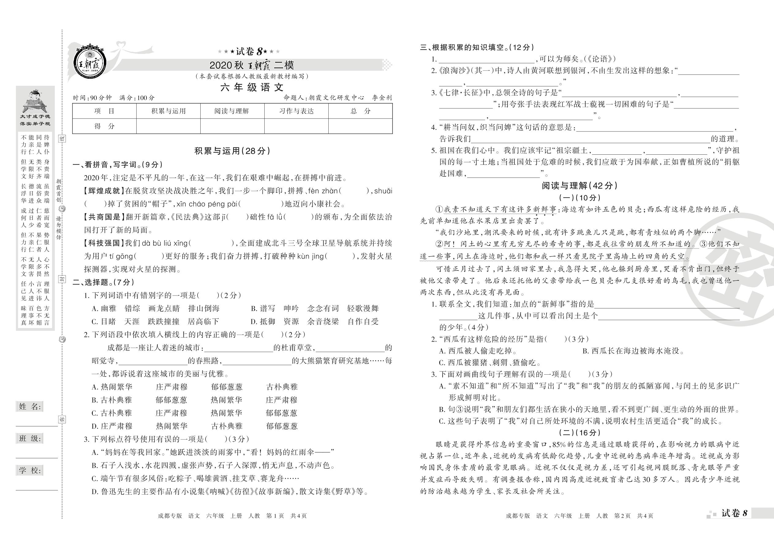 王朝霞期末模拟卷六年级上册语文(人教版)_R21080212406【8】