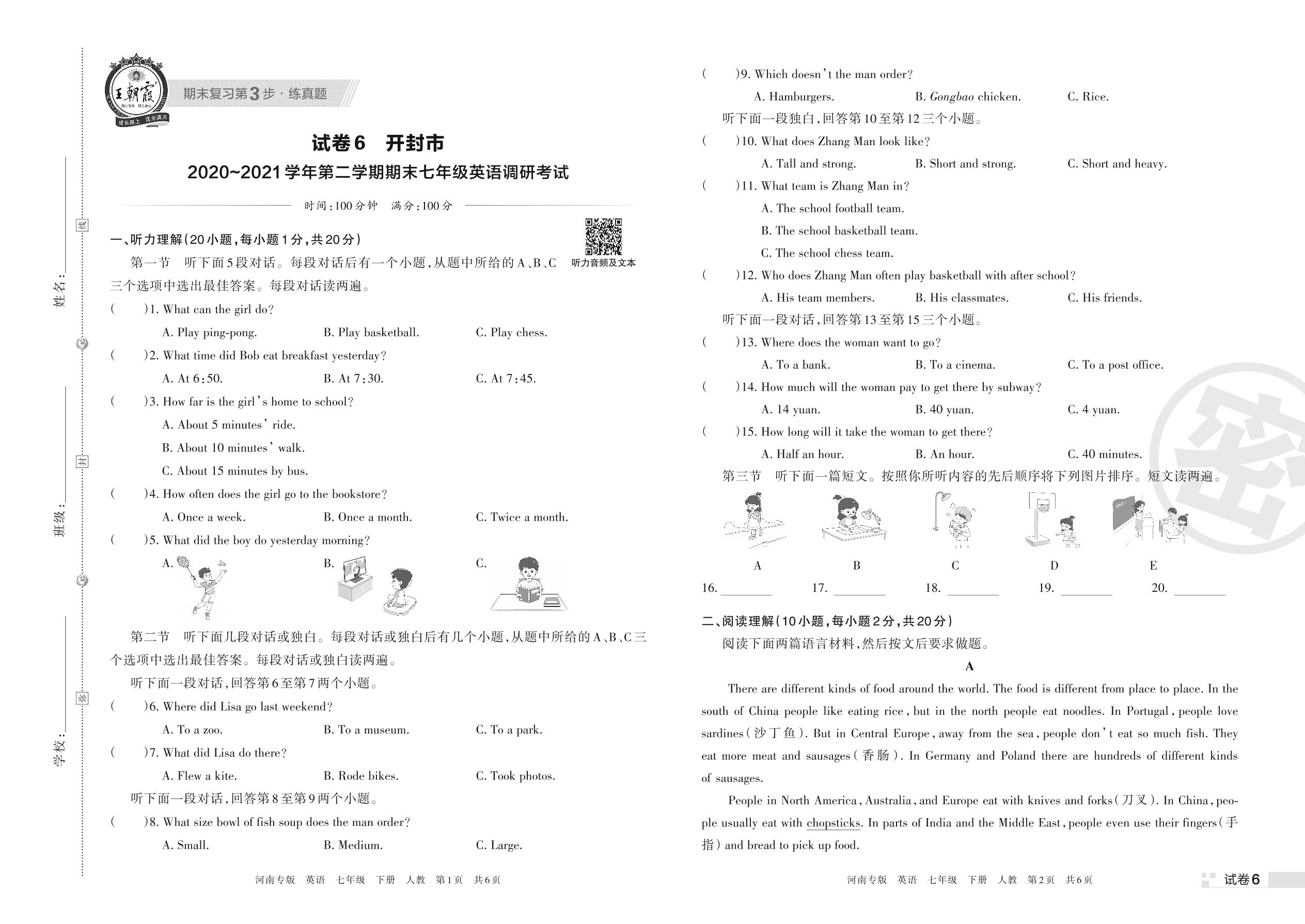 开封市2020~2021学年第二学期期末七年级英语调研考试(人教版)【6】