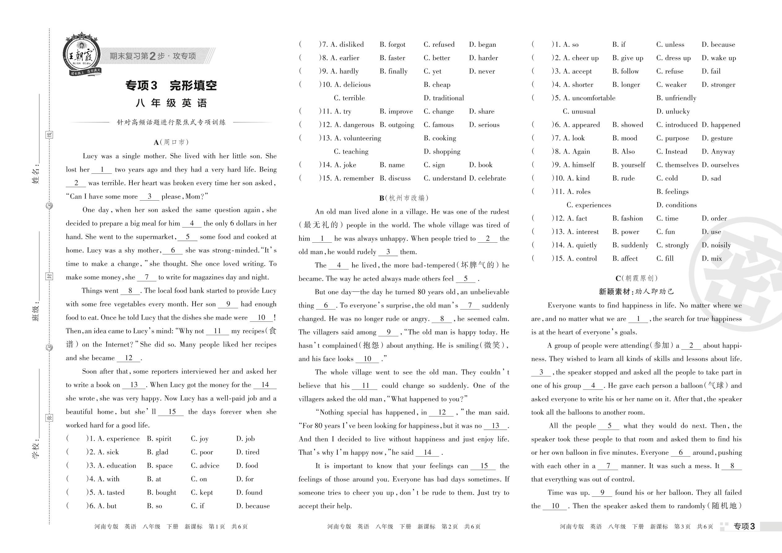 王朝霞期末专项卷——完形填空八年级下册英语(新课标版)_R220324095722907【3】