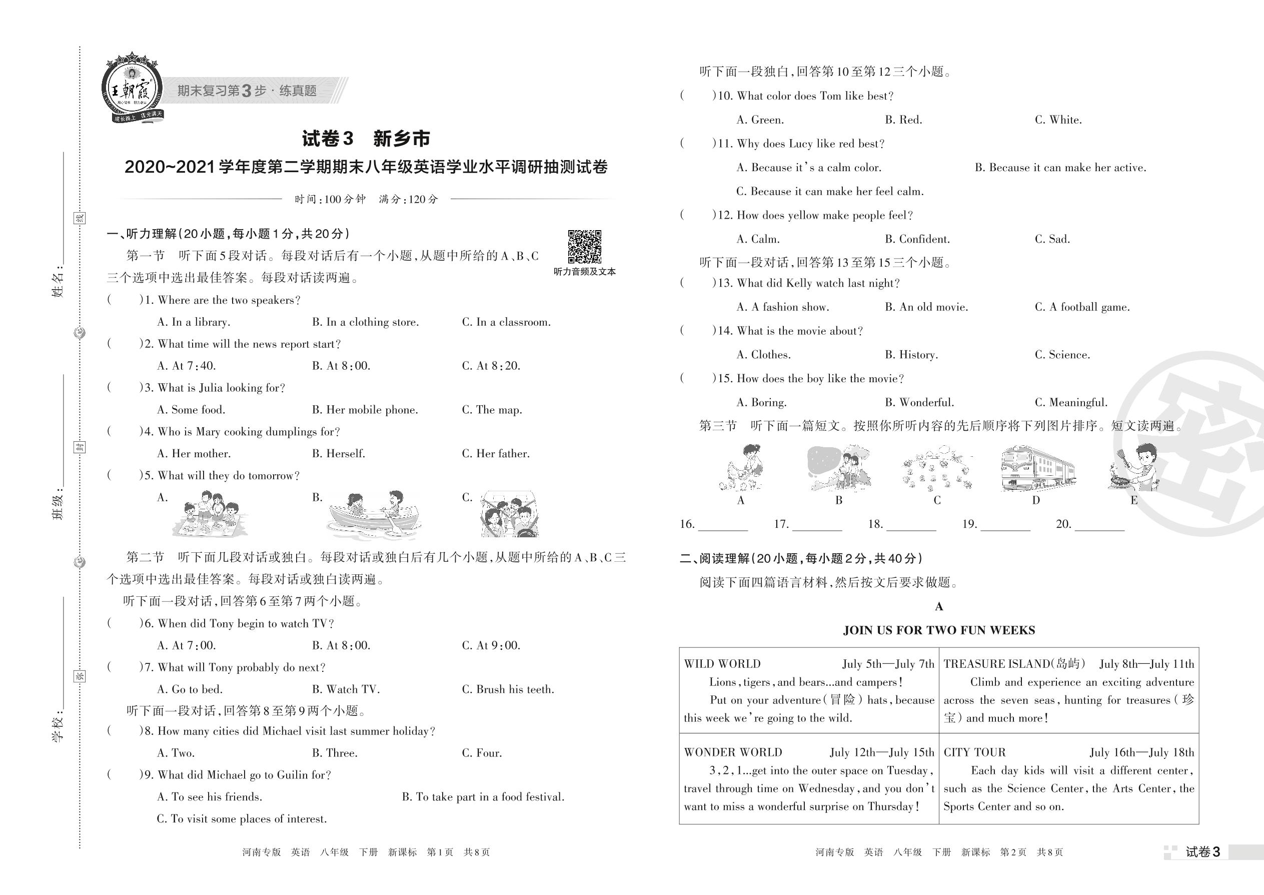 新乡市2020~2021学年度第二学期期末八年级英语学业水平调研抽测试卷(新课标版)【3】
