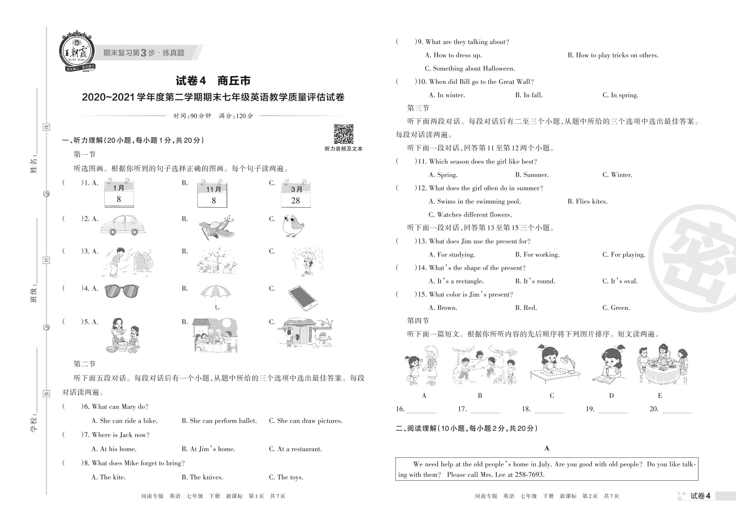 商丘市2020~2021学年度第二学期期末七年级英语教学质量评估试卷(新课标版)【4】