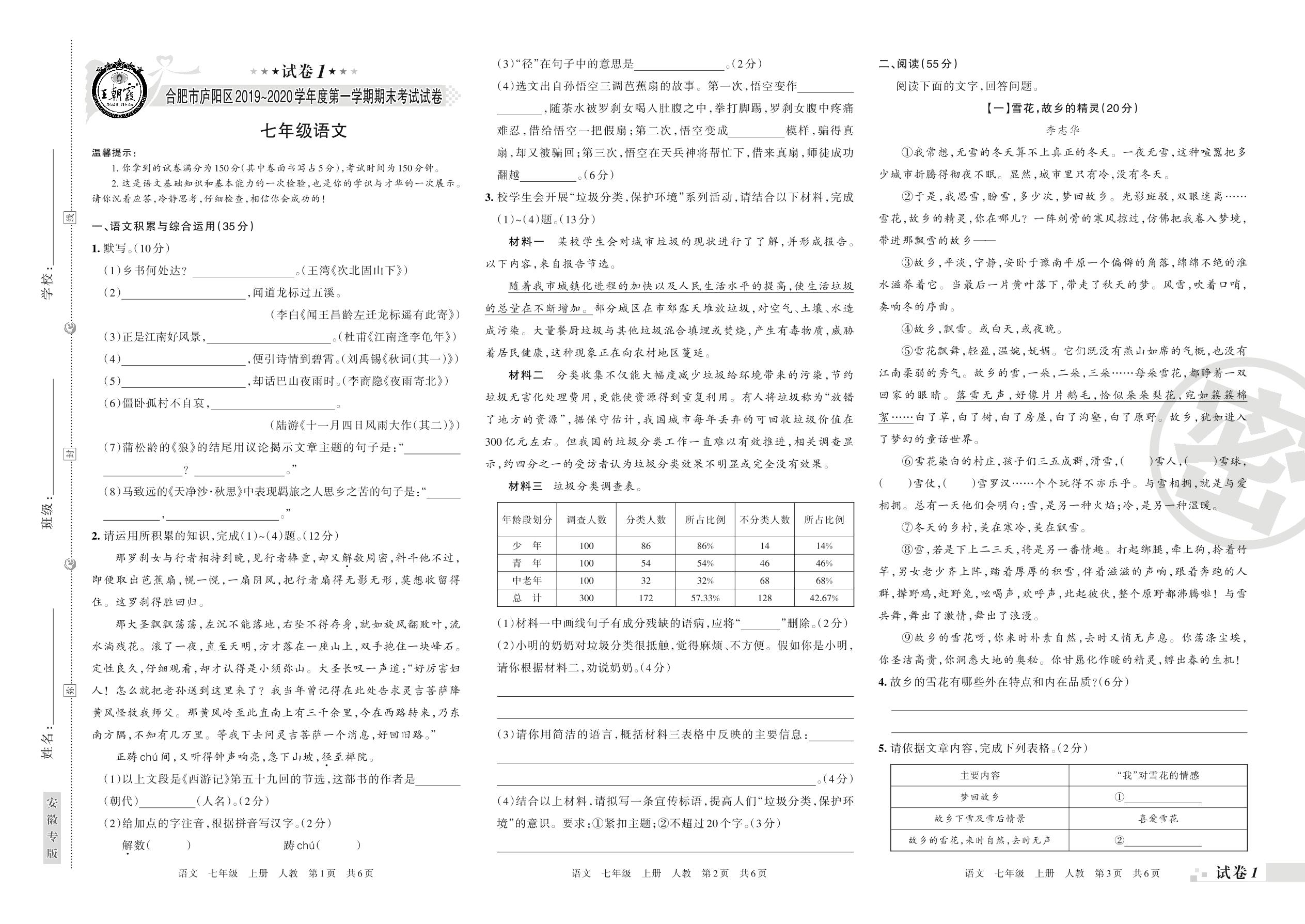 2019-2020学年第一学期合肥市庐阳区七年级语文试卷(人教版)【1】