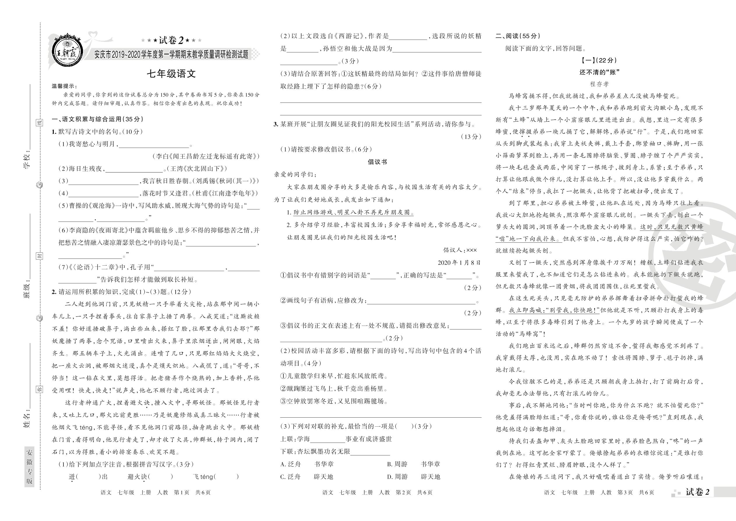 2019-2020学年第一学期安庆市七年级语文试卷(人教版)【2】