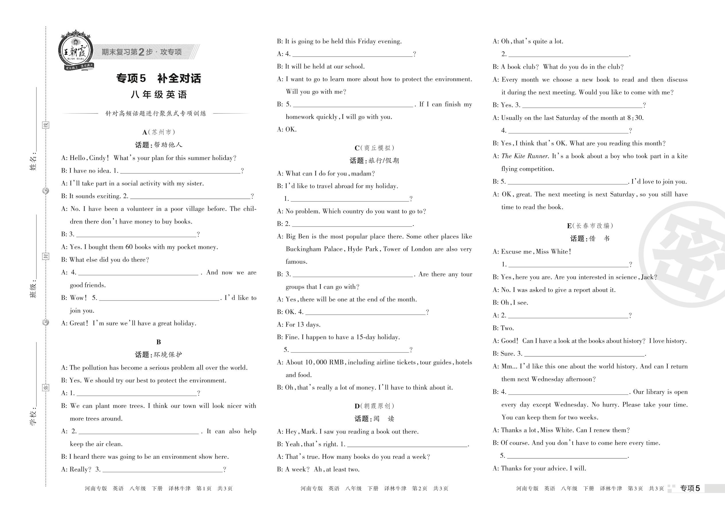 王朝霞期末专项卷——补全对话八年级下册英语(译林牛津版)【5】