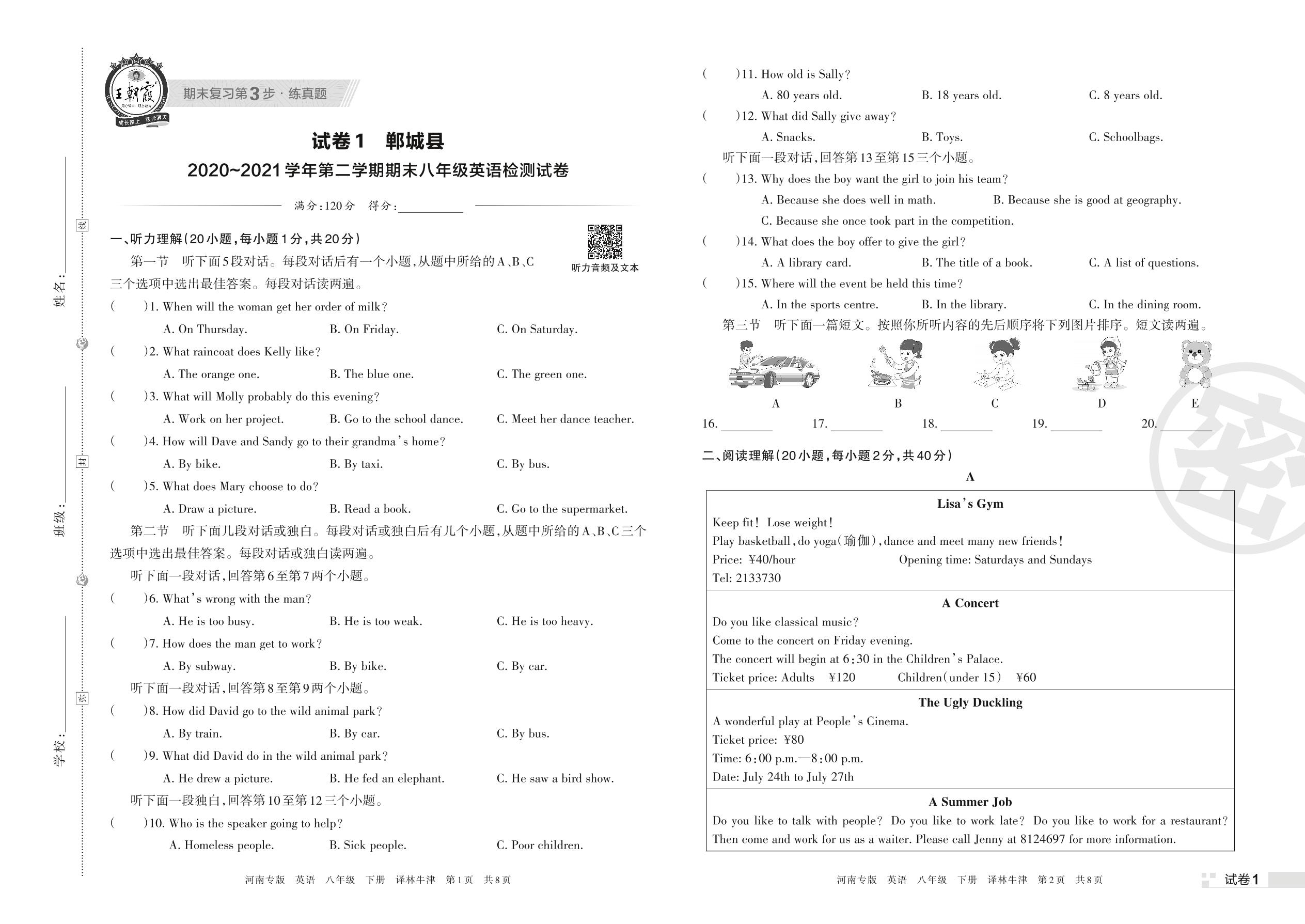 郸城县2020~2021学年第二学期期末八年级英语检测试卷(译林牛津版)【1】