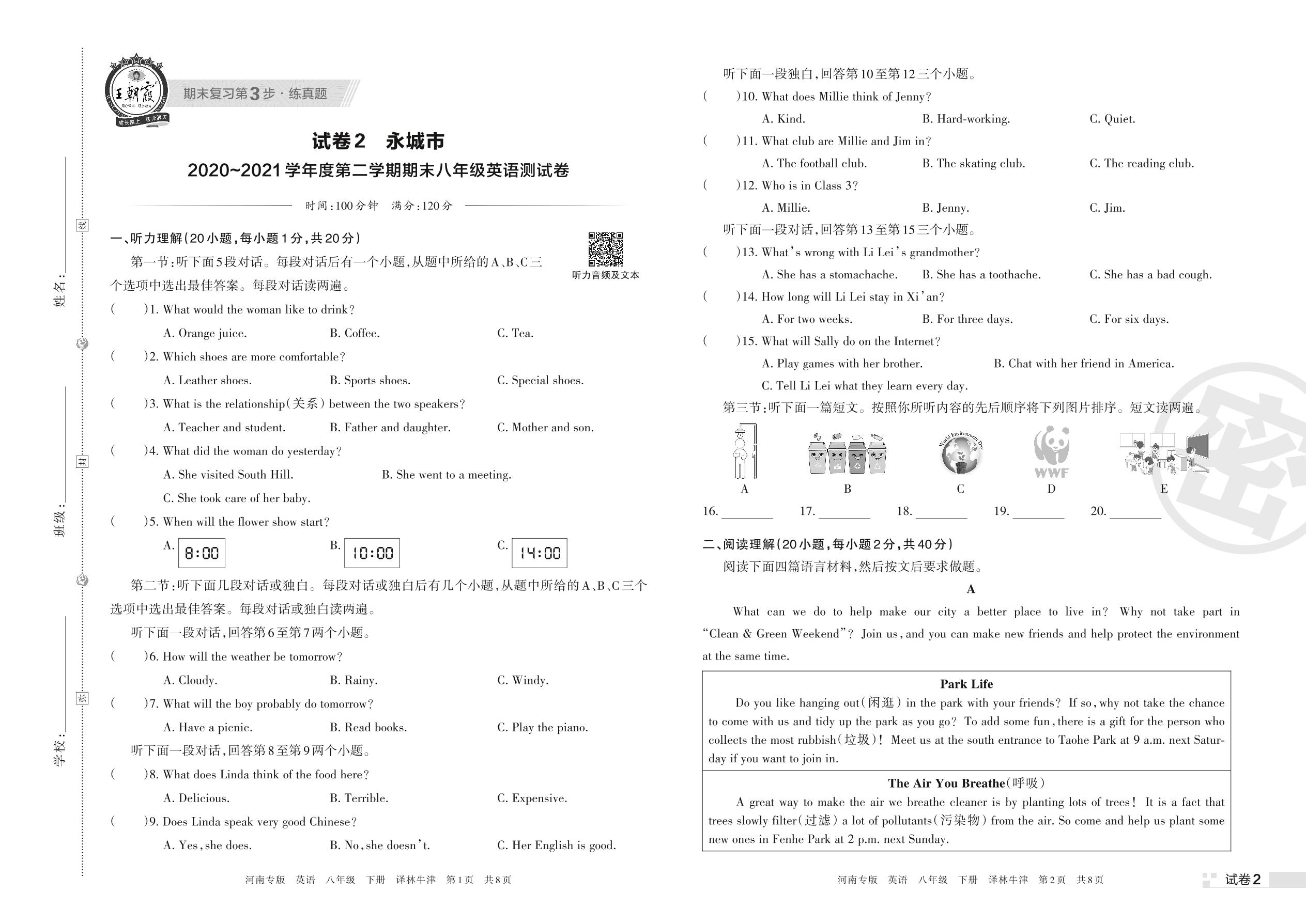 永城市2020~2021学年度第二学期期末八年级英语测试卷(译林牛津版)【2】
