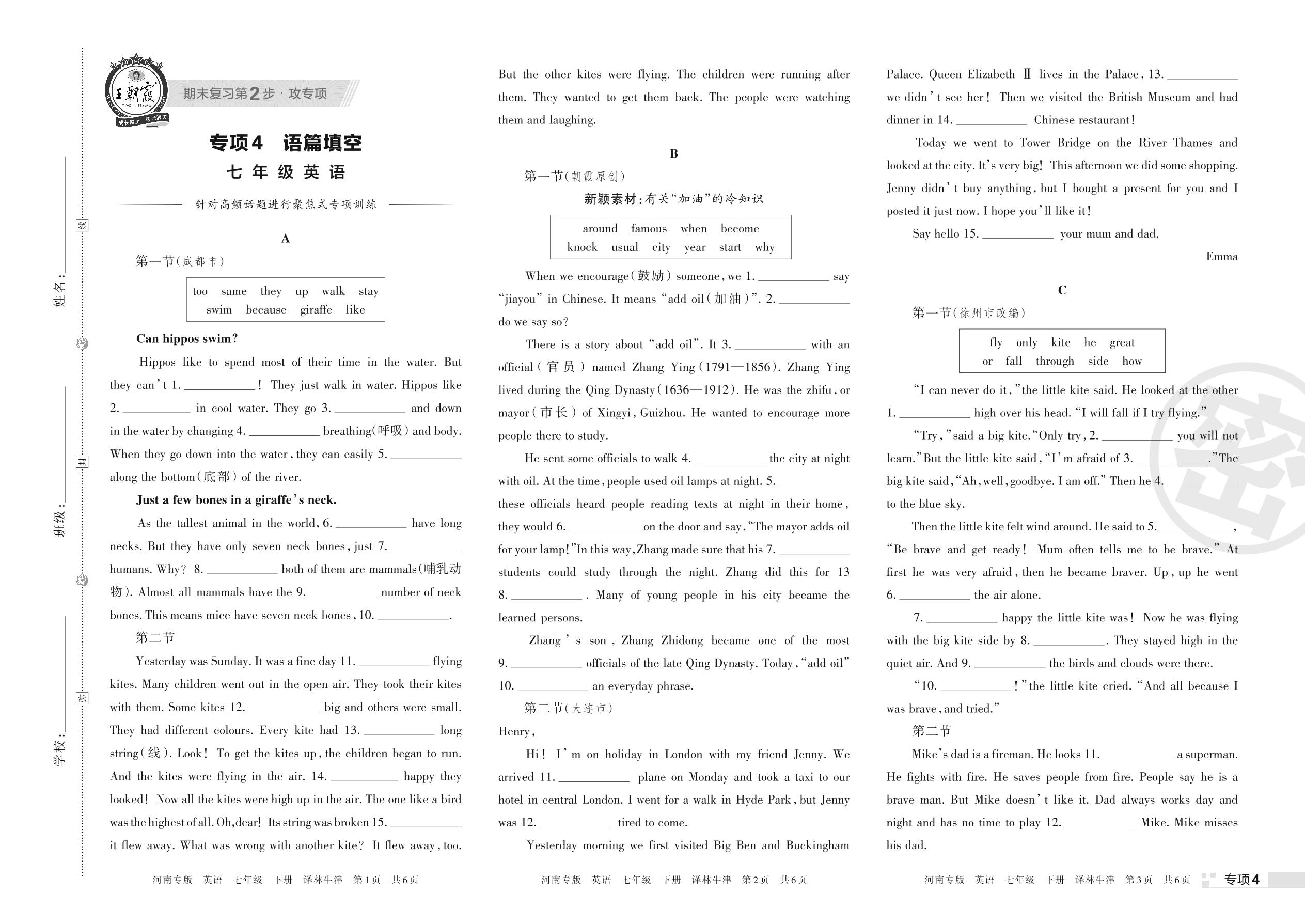 王朝霞期末专项卷——语篇填空七年级下册英语(译林牛津版)【4】