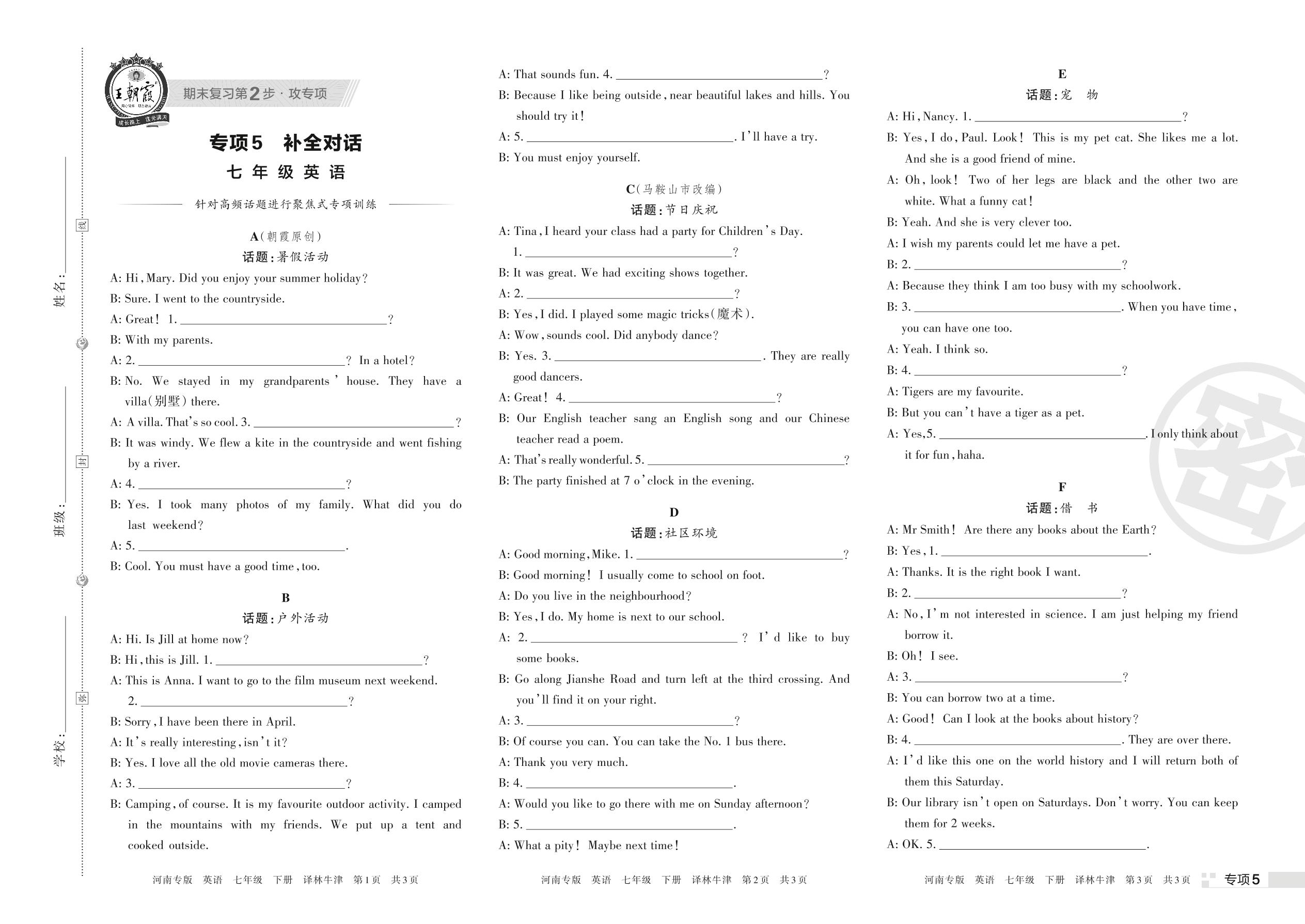 王朝霞期末专项卷——补全对话七年级下册英语(译林牛津版)【5】