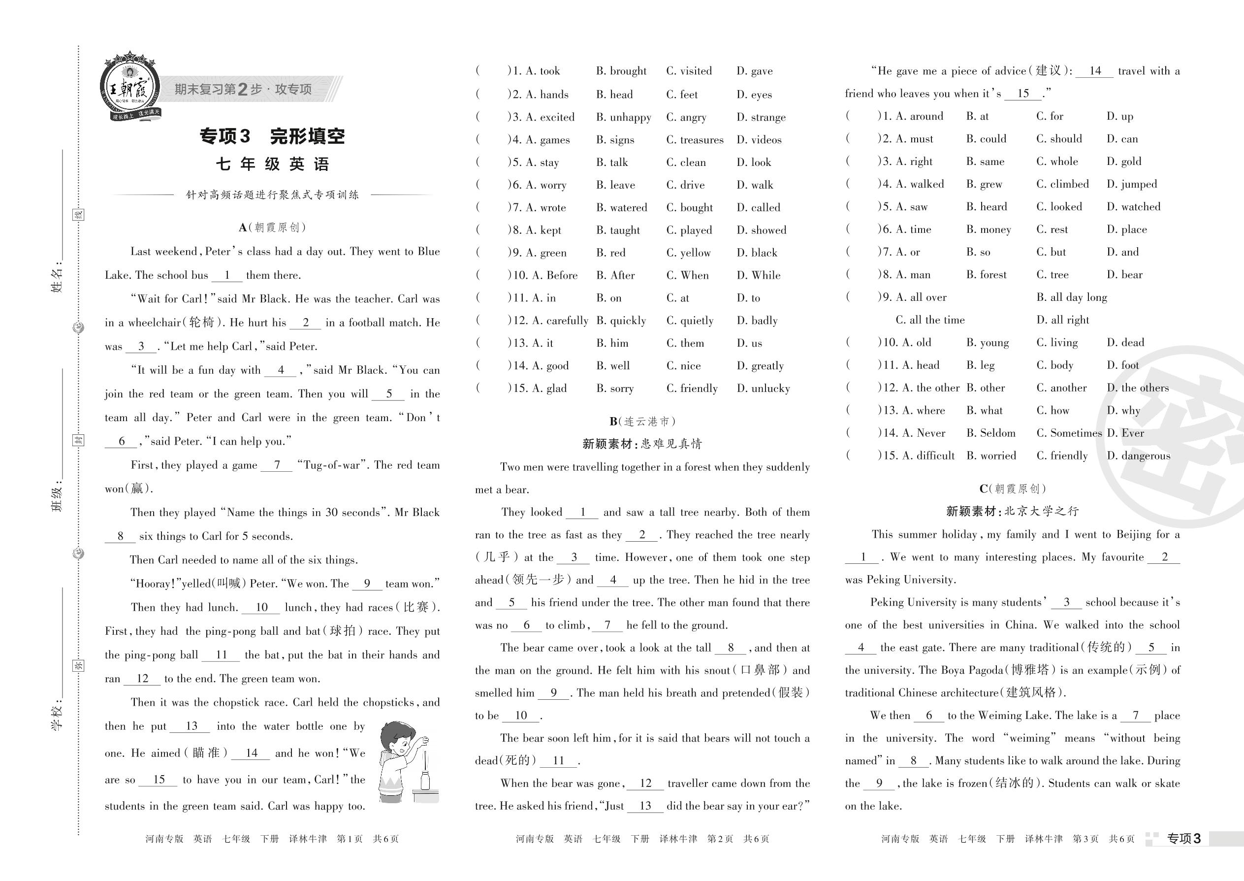 王朝霞期末专项卷——完形填空七年级下册英语(译林牛津版)【3】