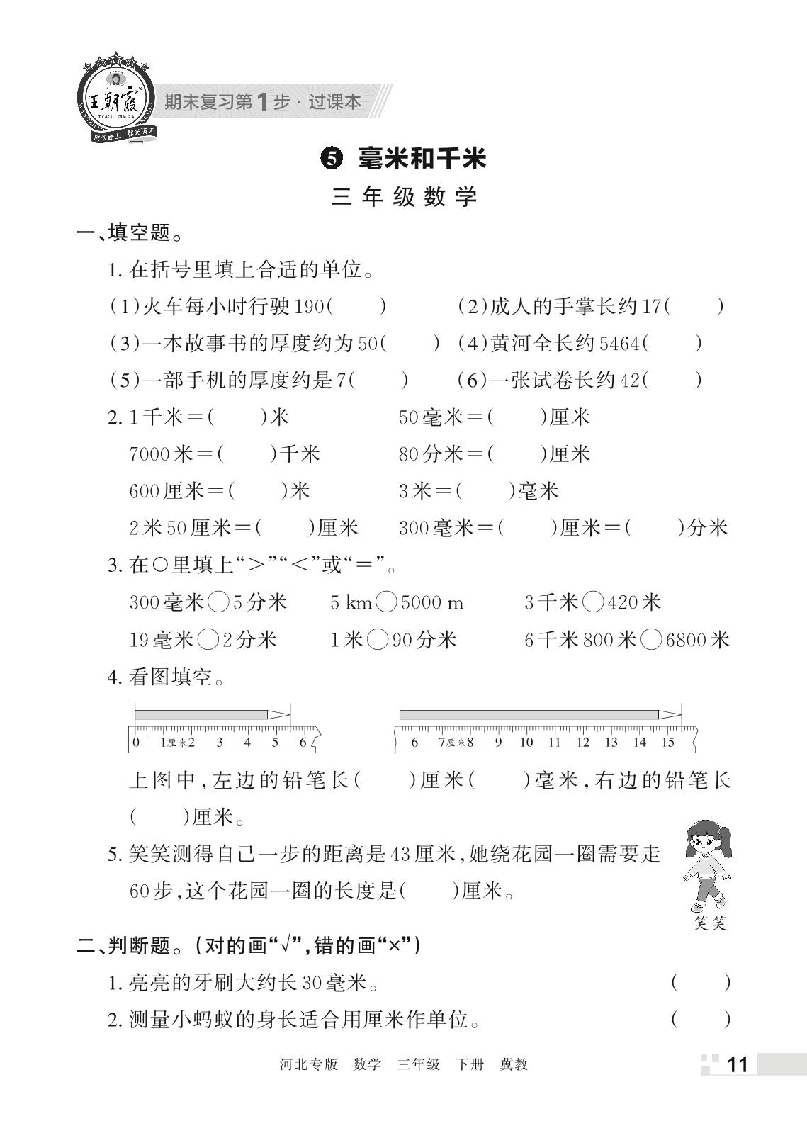 王朝霞期末过课本——5 毫米和千米三年级下册数学(冀教版)