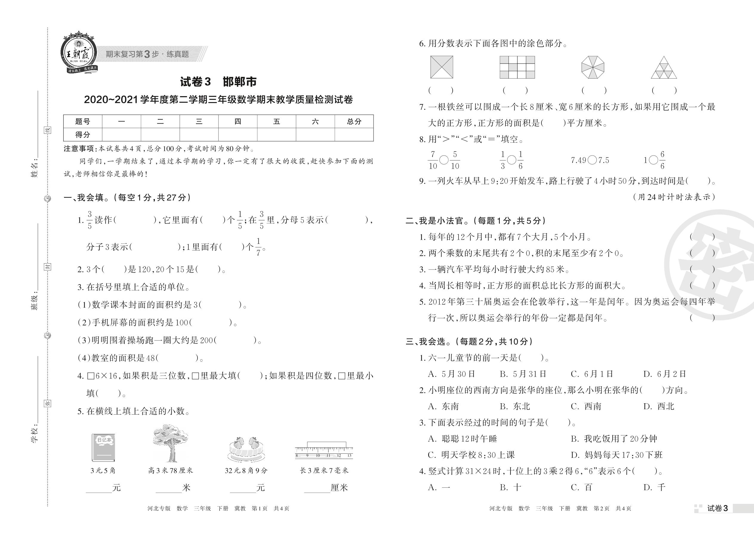 邯郸市2020~2021学年度第二学期三年级数学期末教学质量检测试卷(冀教版)【3】