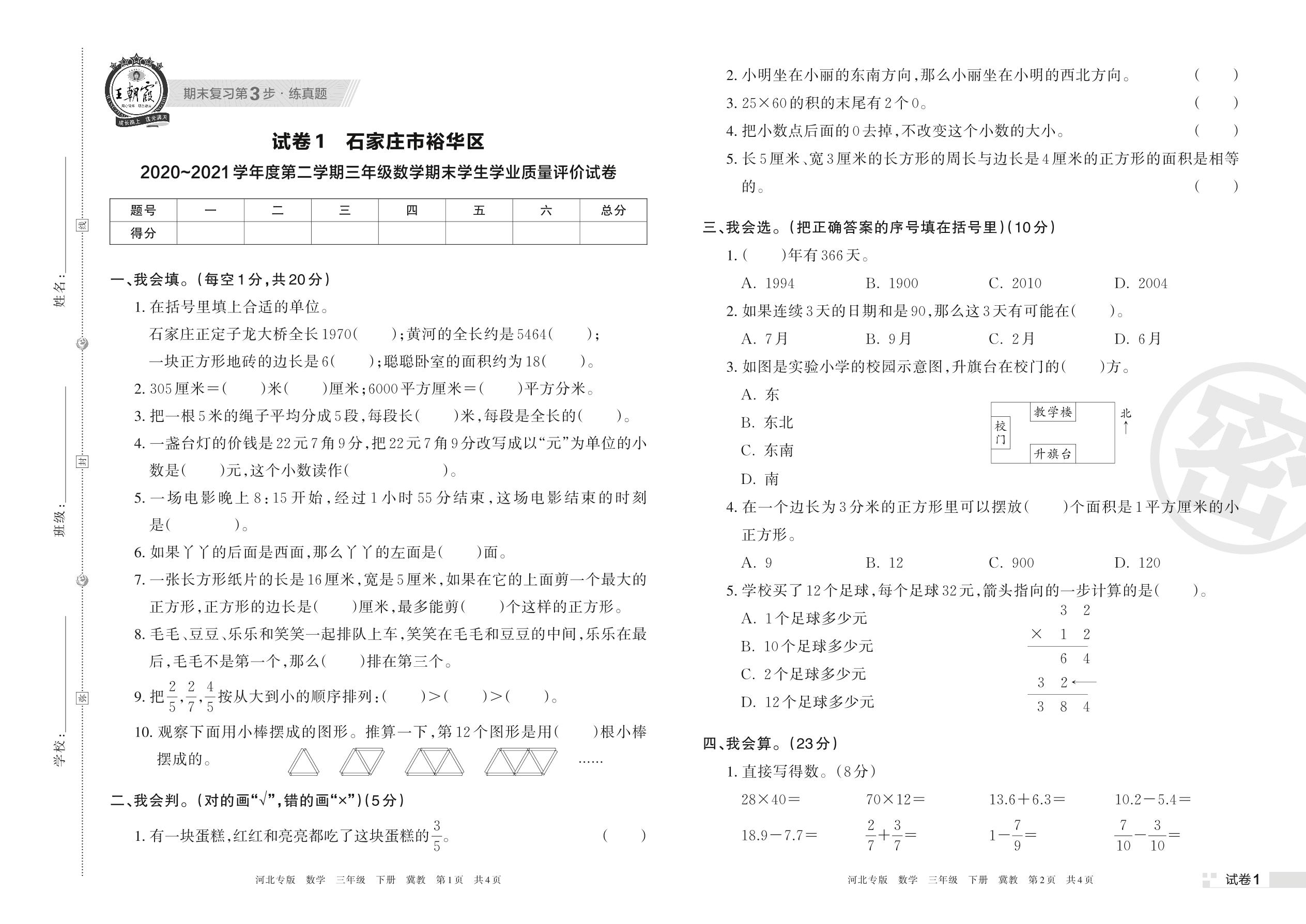 石家庄市裕华区2020~2021学年度第二学期三年级数学期末学生学业质量评价试卷(冀教版)【1】