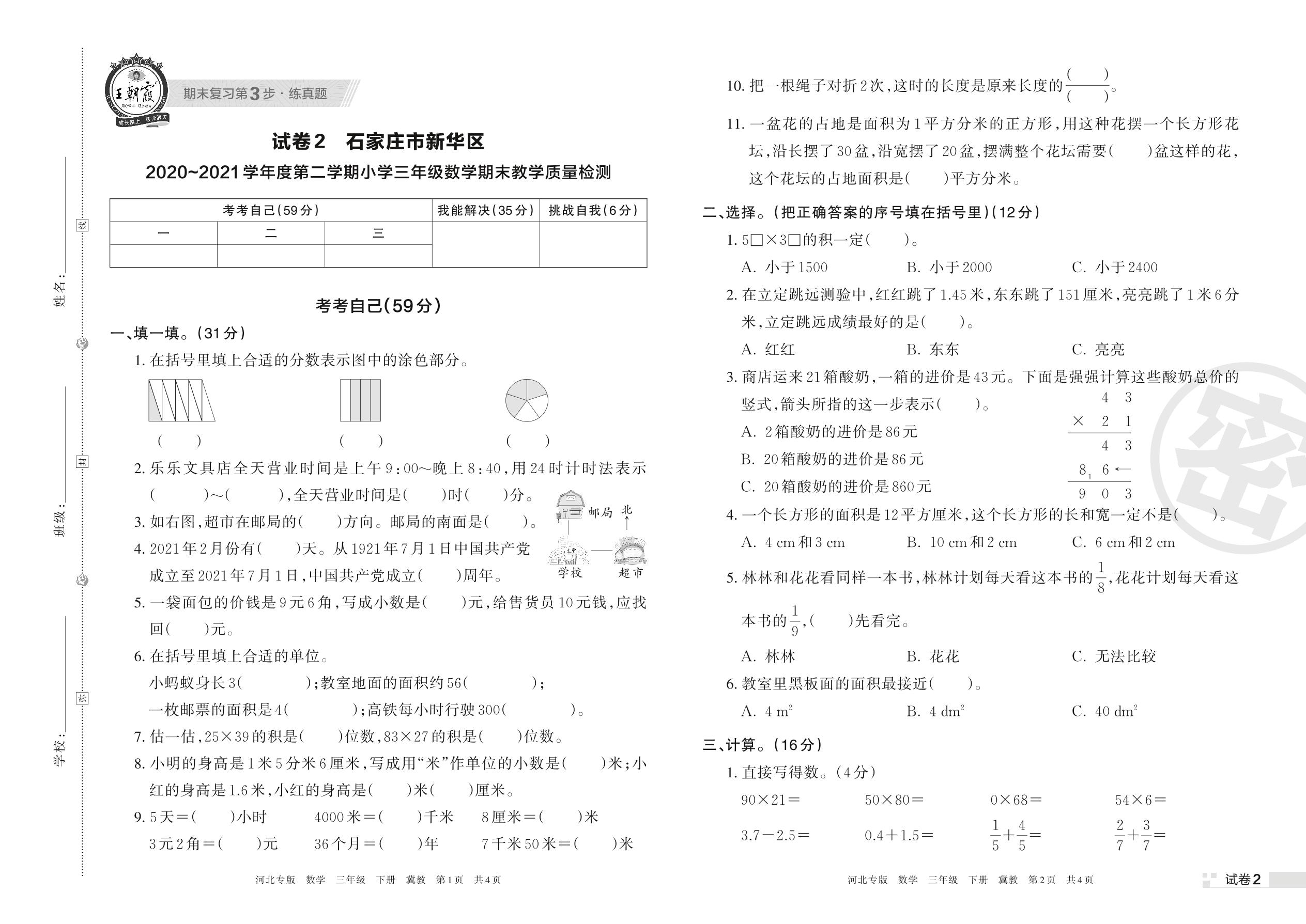 石家庄市新华区2020~2021学年度第二学期小学三年级数学期末教学质量检测(冀教版)【2】