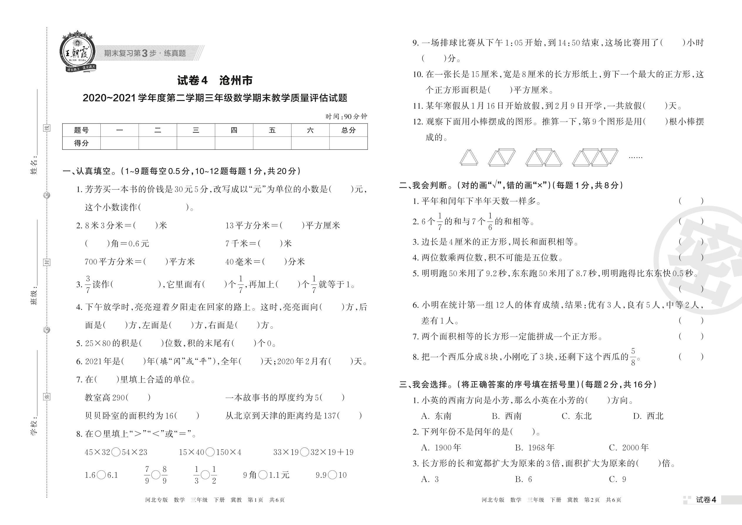 沧州市2020~2021学年度第二学期三年级数学期末教学质量评估试题(冀教版)【4】