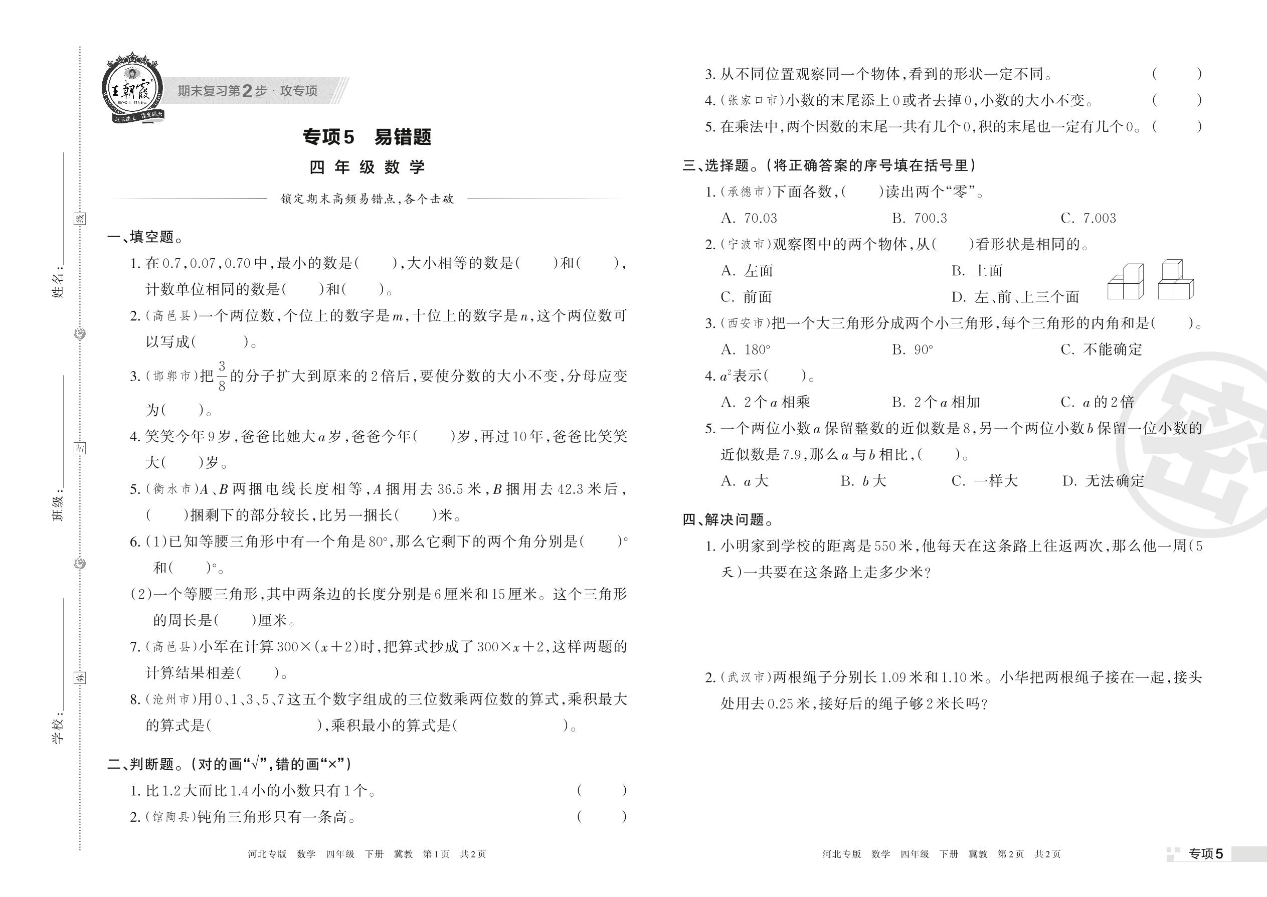王朝霞期末专项卷——易错题四年级下册数学(冀教版)【5】