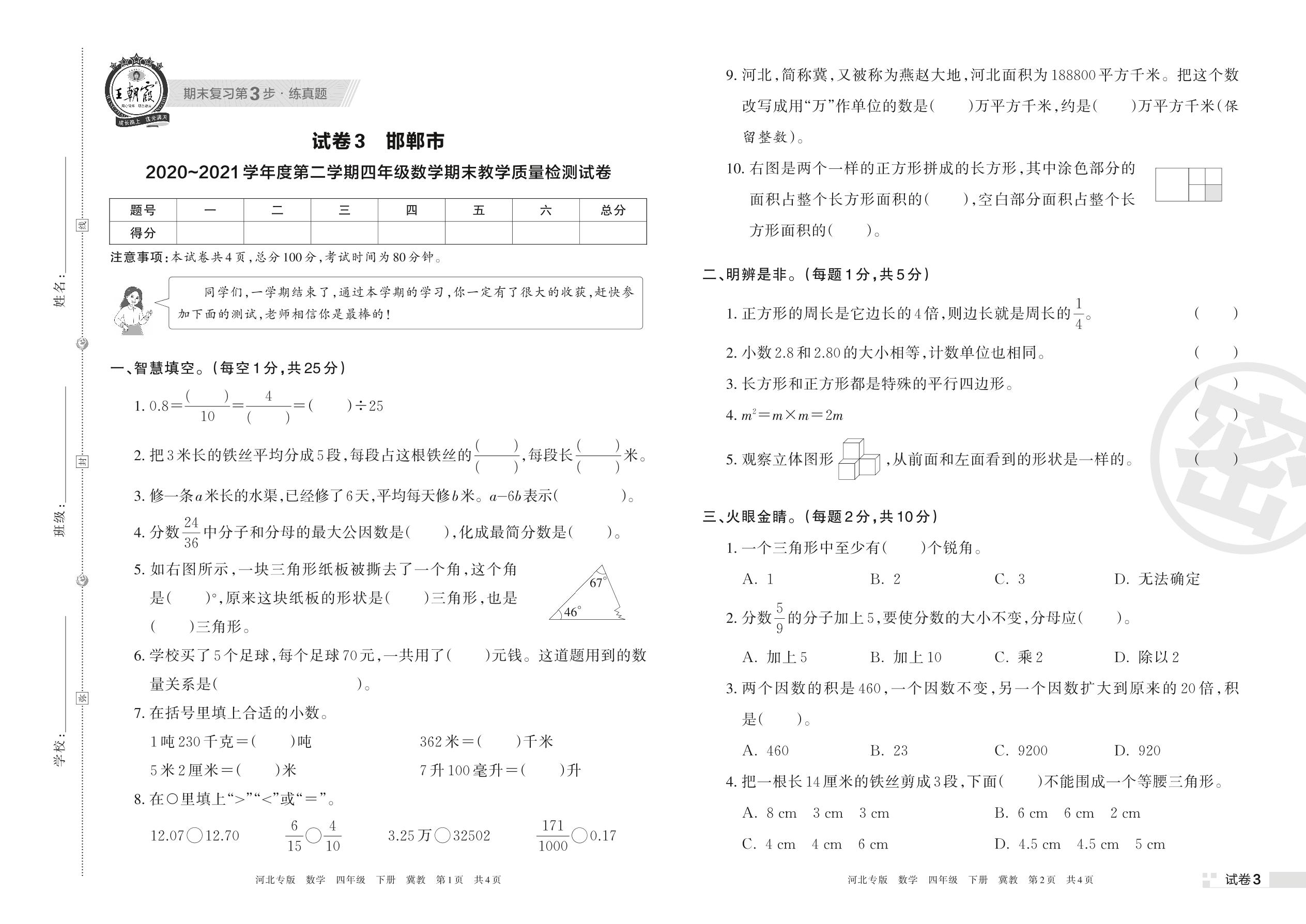 邯郸市2020~2021学年度第二学期四年级数学期末教学质量检测试卷(冀教版)【3】