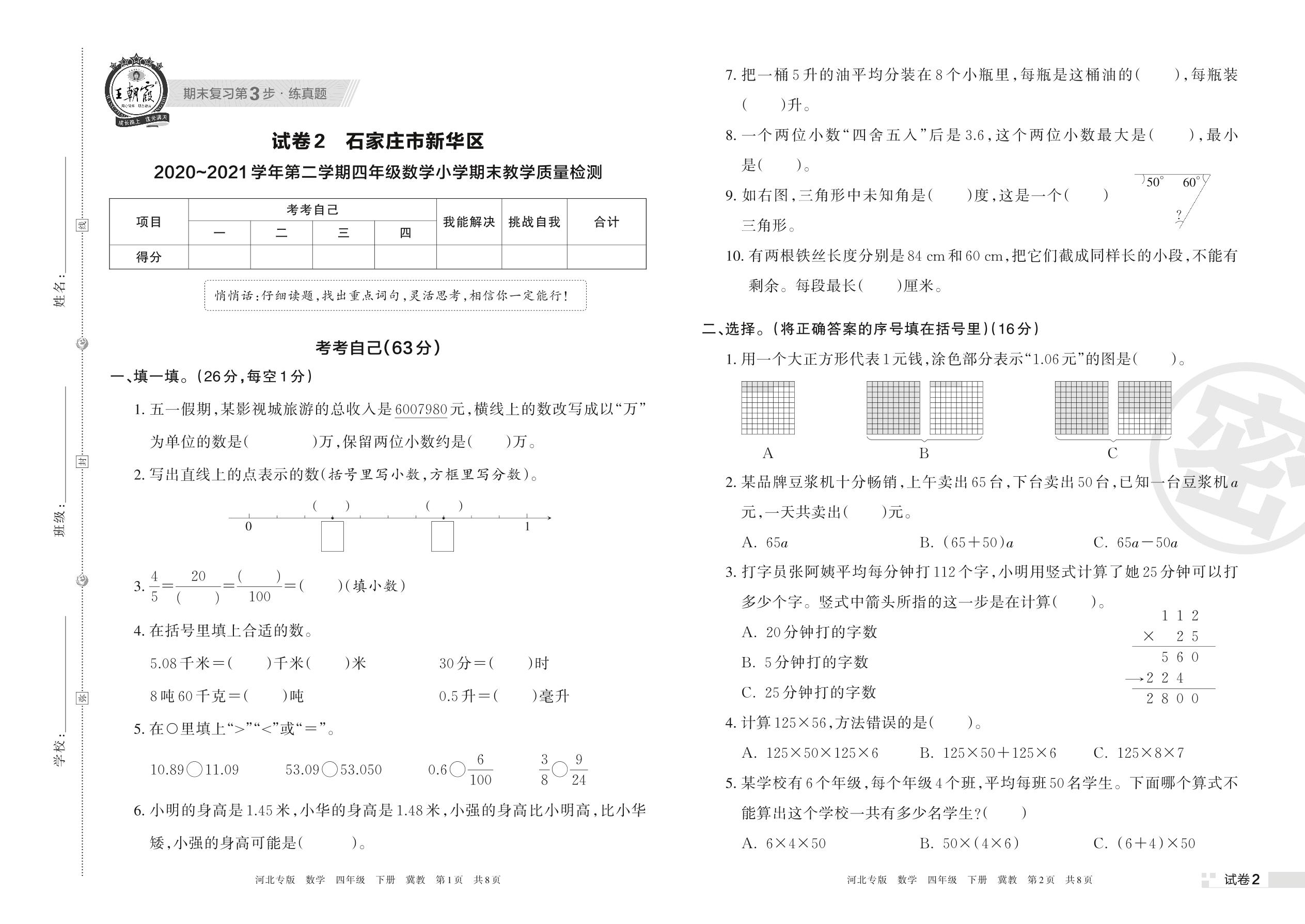 石家庄市新华区2020~2021学年第二学期四年级数学小学期末教学质量检测(冀教版)【2】