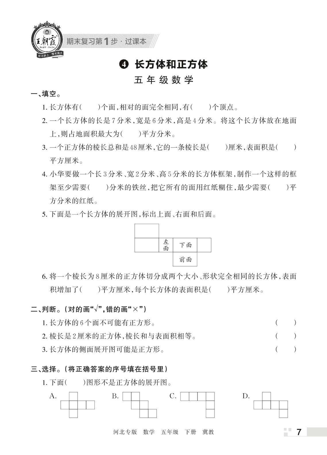 王朝霞期末过课本——4 长方体和正方体五年级下册数学(冀教版)
