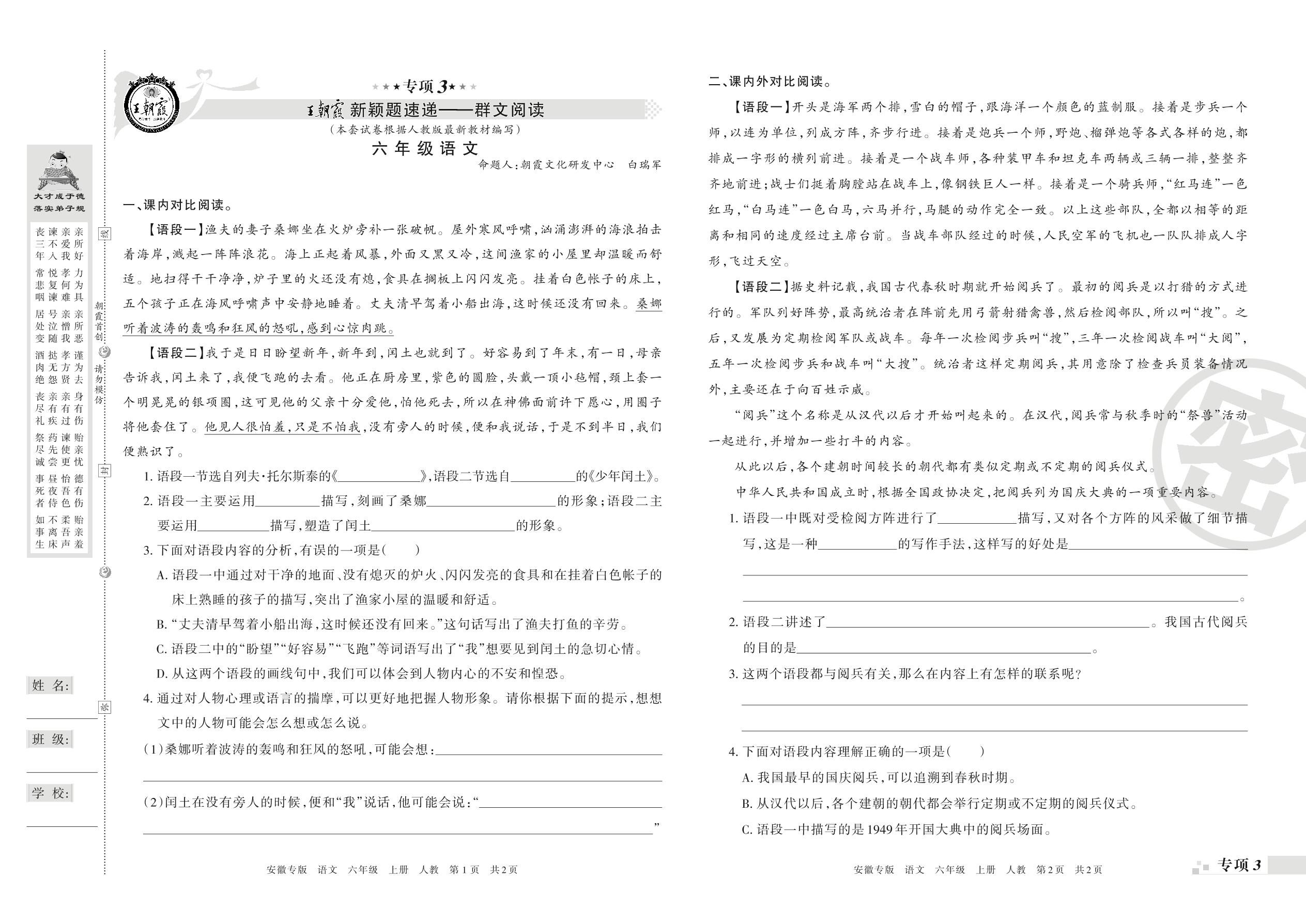 王朝霞期末专项卷——群文阅读、古诗文阅读六年级上册语文(人教版)_R21080212652【0】
