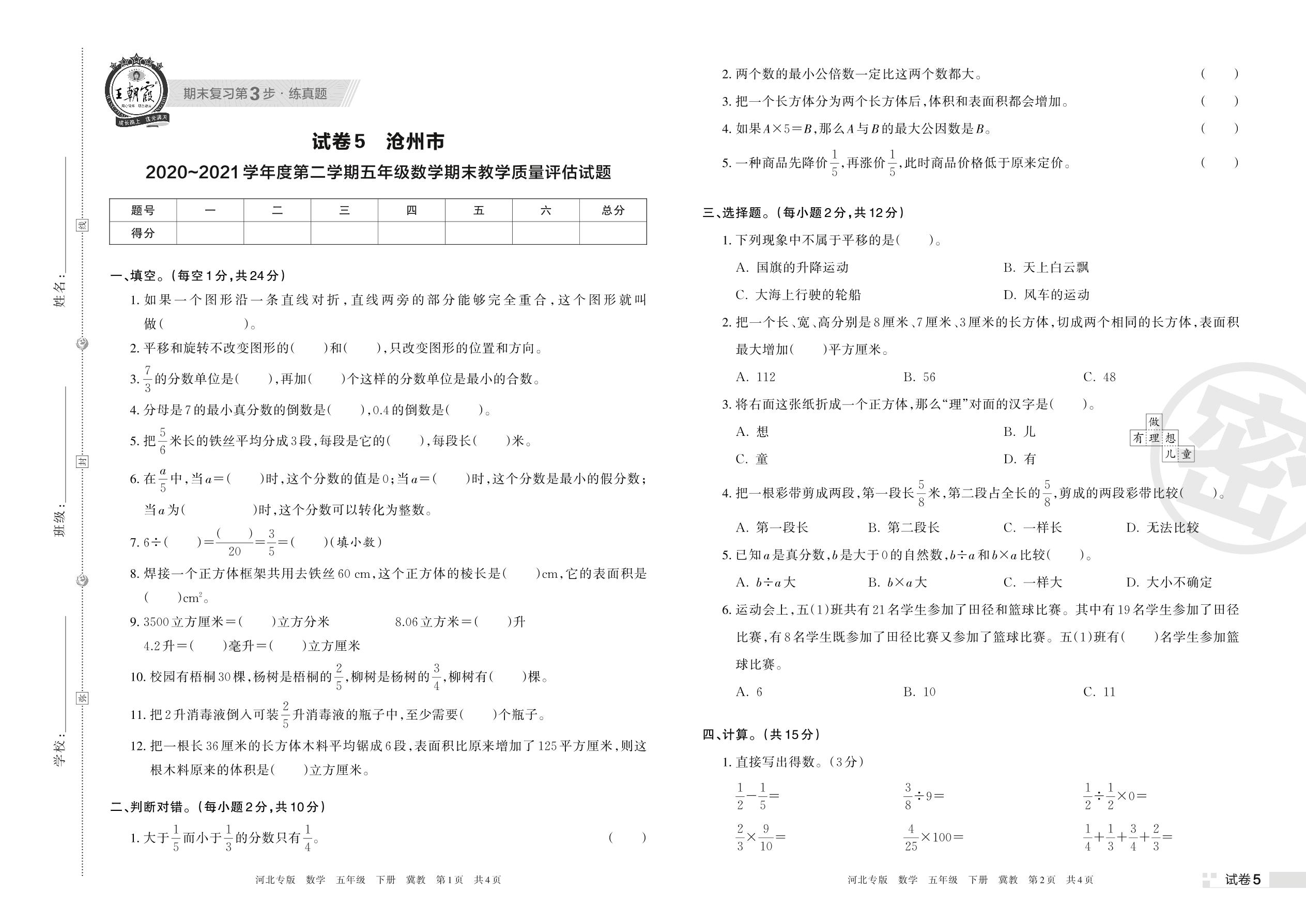 沧州市2020~2021学年度第二学期五年级数学期末教学质量评估试题(冀教版)【5】