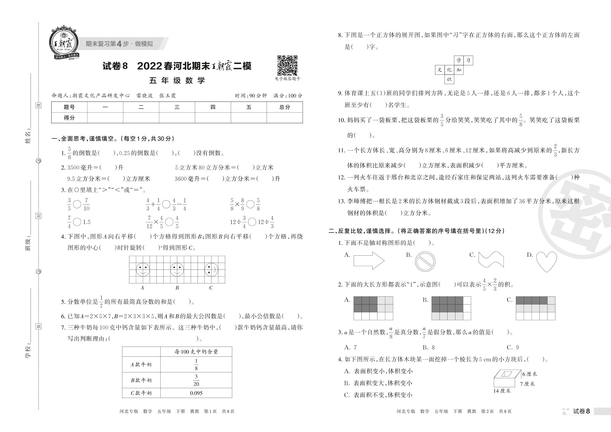 王朝霞期末模拟卷五年级下册数学(冀教版)_R220326103001407【8】