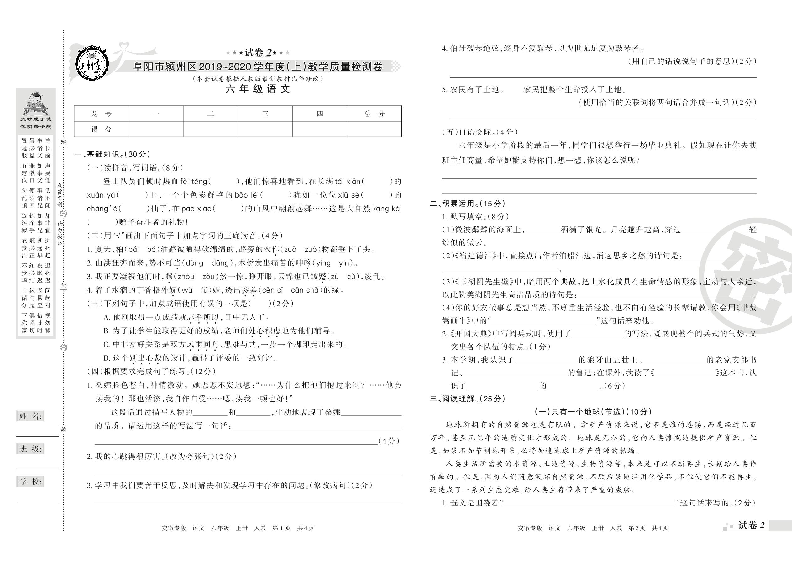 2019-2020学年第一学期阜阳市颍州市六年级语文试卷(人教版)【2】