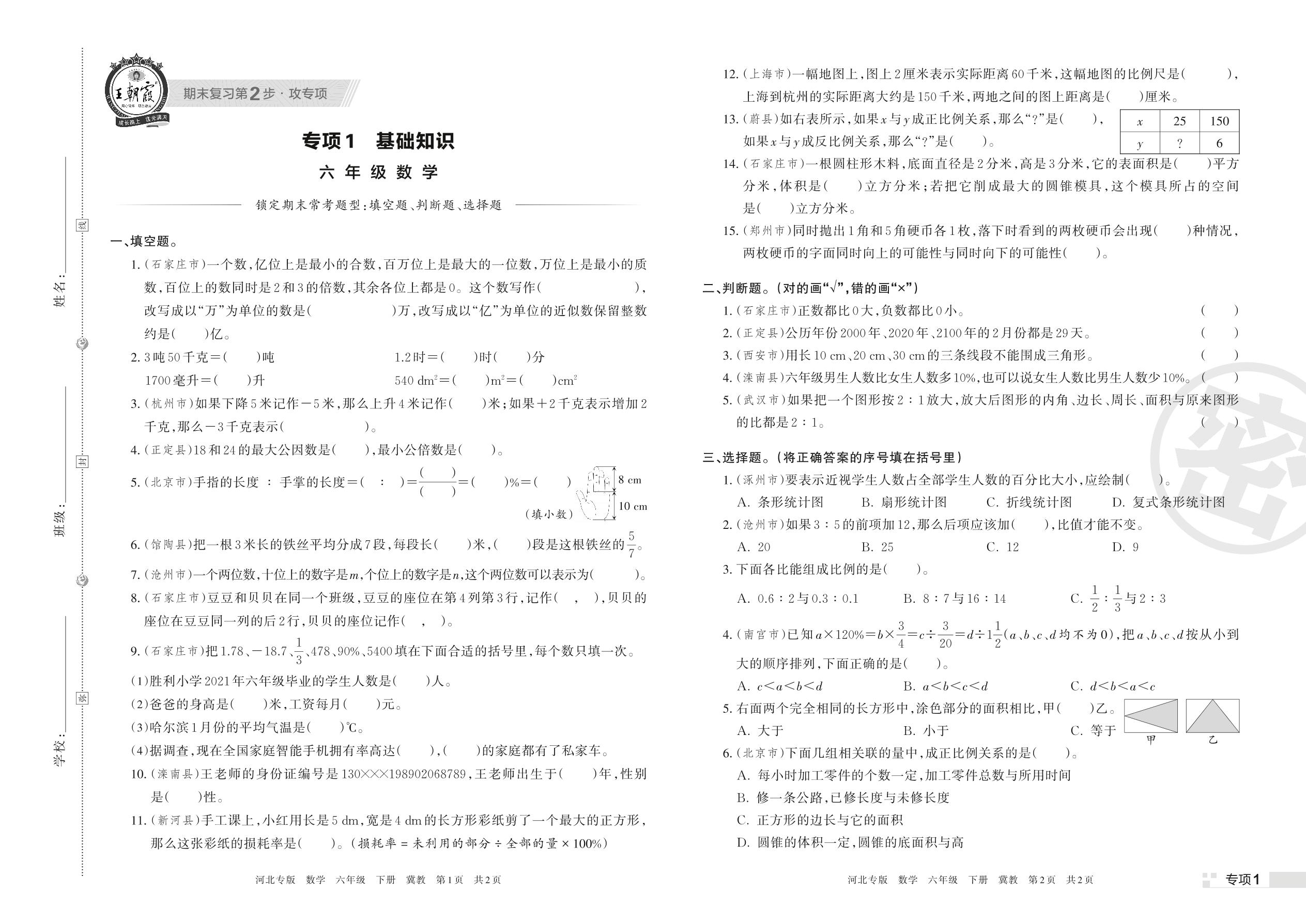 王朝霞期末专项卷——基础知识六年级下册数学(冀教版)【1】