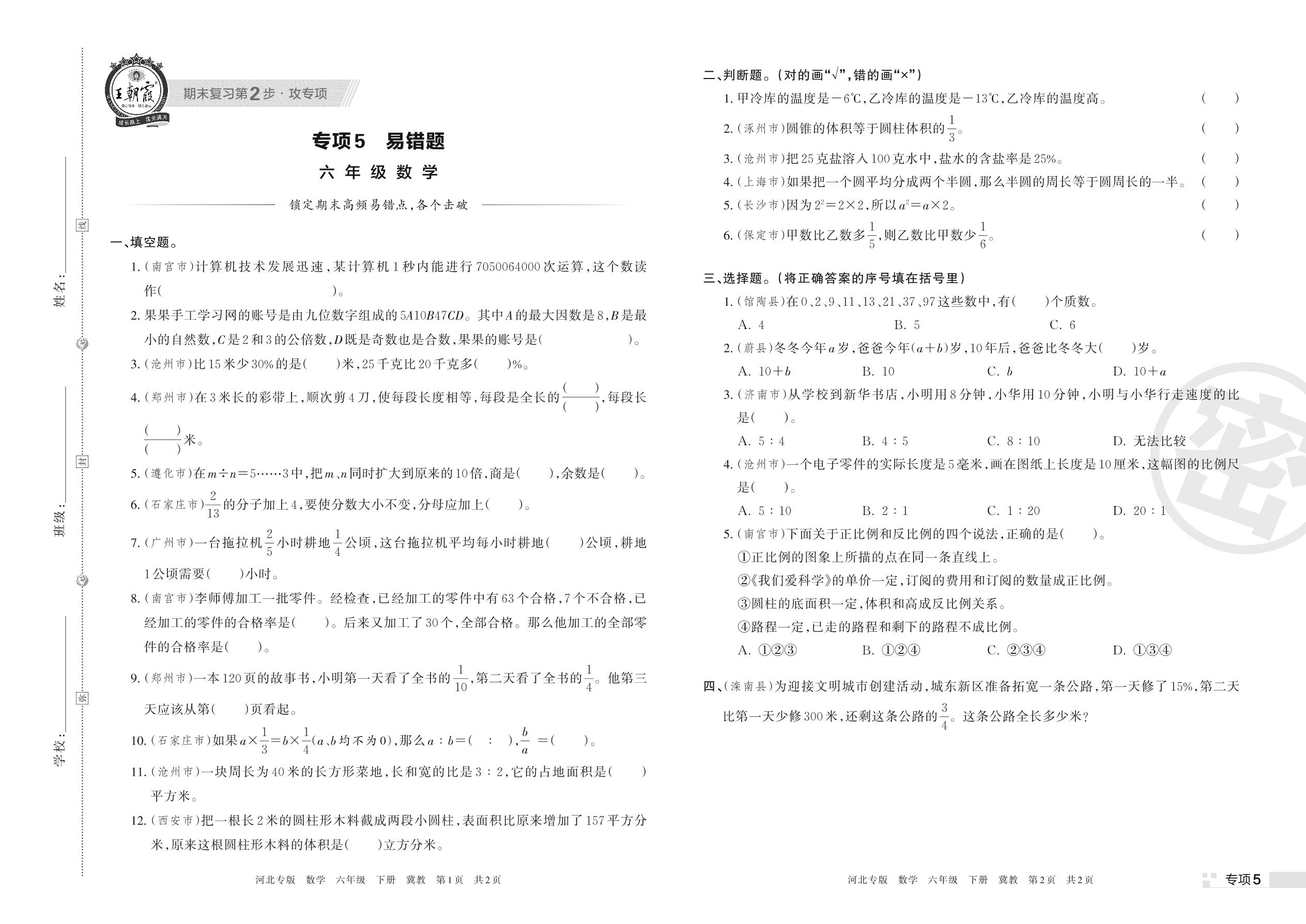 王朝霞期末专项卷——易错题六年级下册数学(冀教版)【5】